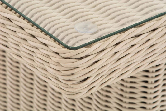 In And OutdoorMatch Gartentisch Rae – Glastisch aus Rattangeflecht – Gartenmöbel – Esstisch – Tisch im Freien – Couchtisch – Creme – 138 cm