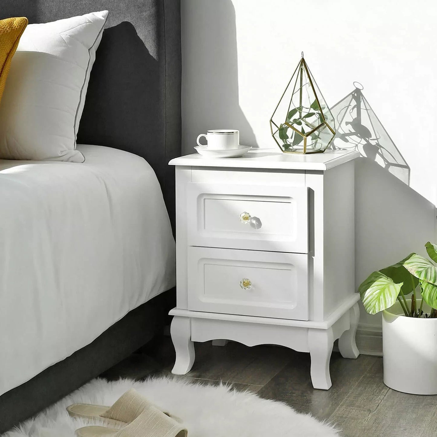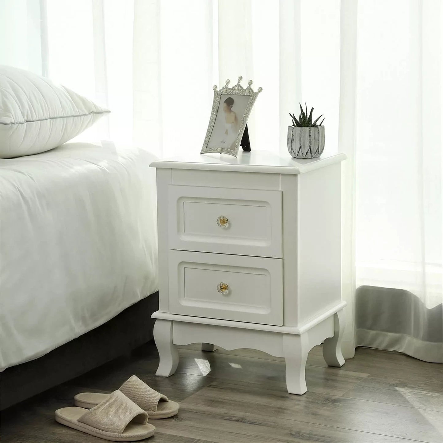 Der inandoutdoormatch-Nachttisch besteht aus hochwertiger MDF-Platte und Massivholz mit edlem Finish. Die schöne Optik und das geschmackvolle Weiß schaffen eine romantische Atmosphäre in Ihrem Zuhause. Darüber hinaus ist er sehr praktisch, man kann ihn auch als Beistelltisch oder Kommode verwenden. Ob im Schlafzimmer oder im Flur, es macht überall eine gute Figur. Außerdem ist es einfach einzurichten und zu reinigen. Für die tägliche Pflege reicht ein weiches Tuch. Ein Nachttisch, auch ein ideales Deko-Accessoire für Ihr Zuhause! Hinweise: - Setzen Sie sich nicht auf den Nachttisch, um Schäden zu vermeiden. - Versuchen Sie nicht, den Nachttisch mit Gewalt zusammenzubauen. Dadurch wird der Artikel beschädigt. Bei Problemen wenden Sie sich bitte an unseren Kundenservice. - Um sicherzustellen, dass die vorgebohrten Gewinde in den Beinen nicht beschädigt werden und die Schrauben nicht schief sitzen, schrauben Sie bei der Montage der Beine die Schrauben erst ein, nachdem alle Bohrlöcher ausgerichtet sind.