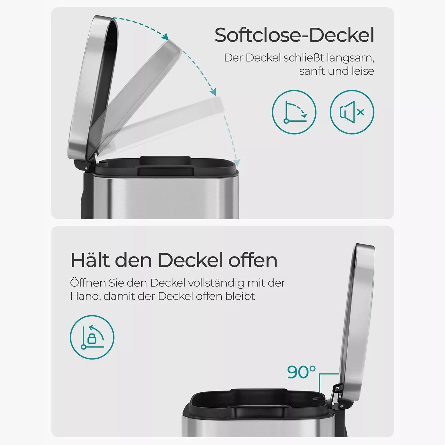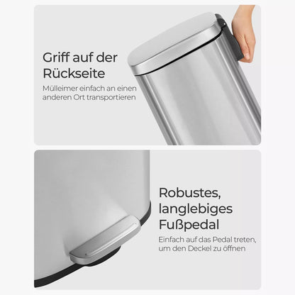 Dieser Mülleimer verfügt über ein breites Fußpedal, sodass Sie ihn nicht mit den Händen öffnen müssen, und über einen eingebauten Dämpfer, sodass sich der Deckel beim Schließen langsam und geräuschlos schließt. Der hochwertige Inneneimer mit einem Fassungsvermögen von 30 L ist mit einem Griff ausgestattet und erleichtert die Entnahme des Kotbeutels.