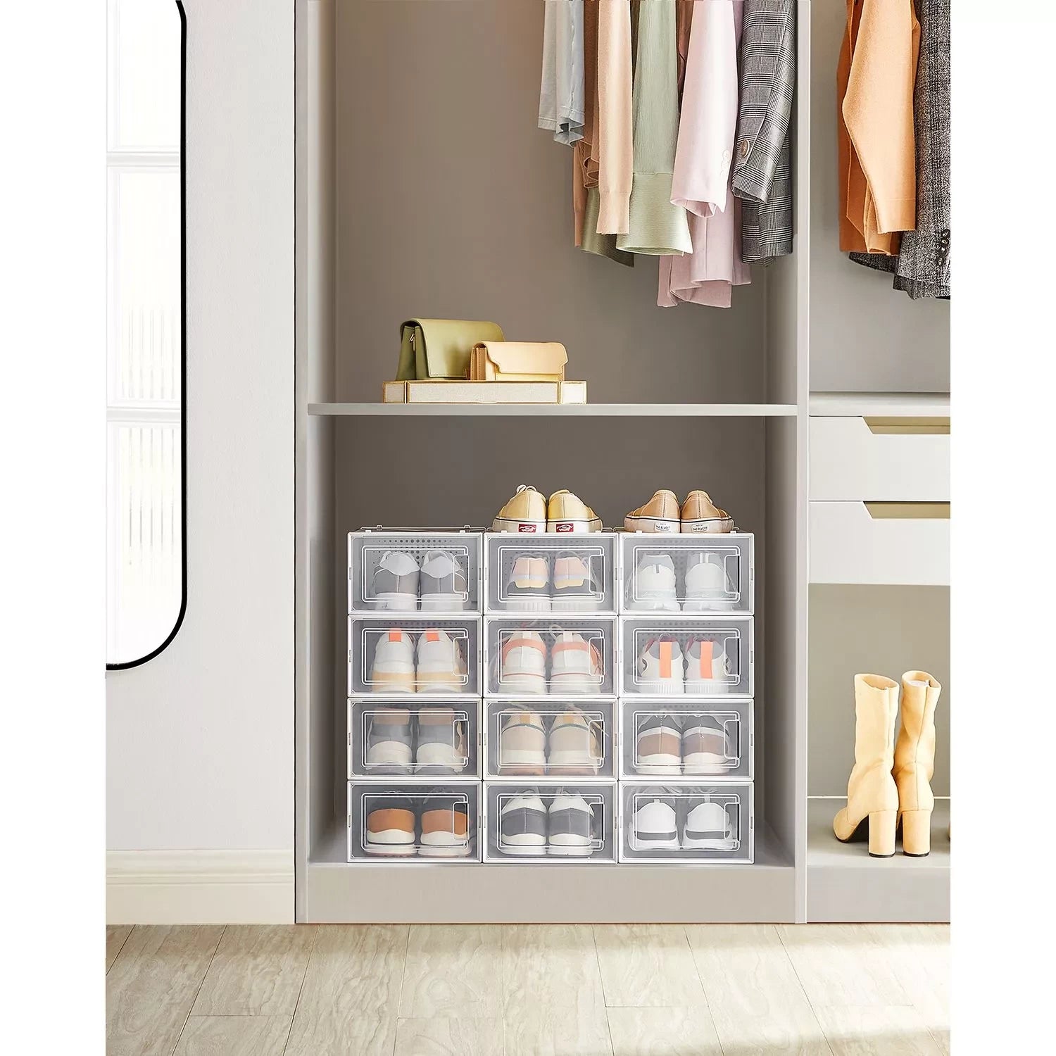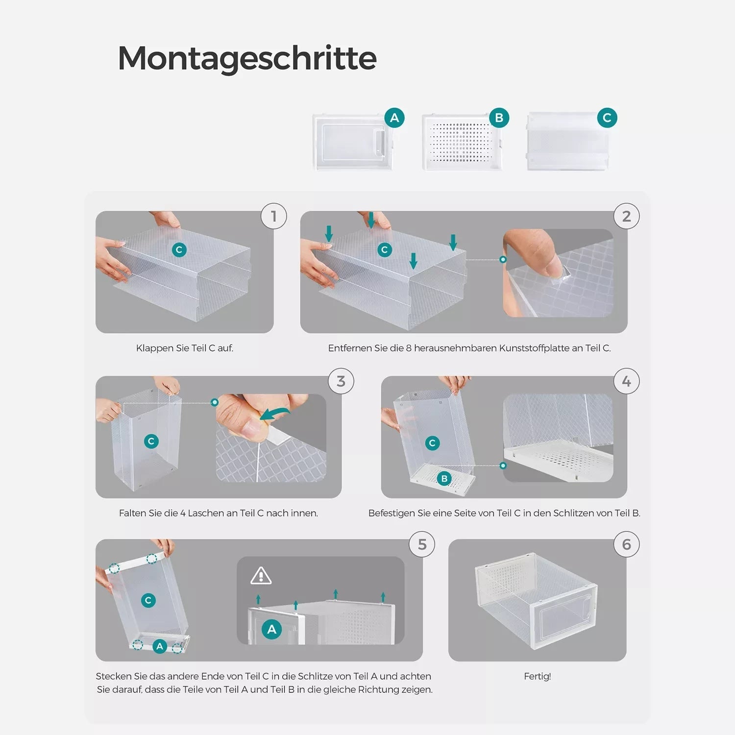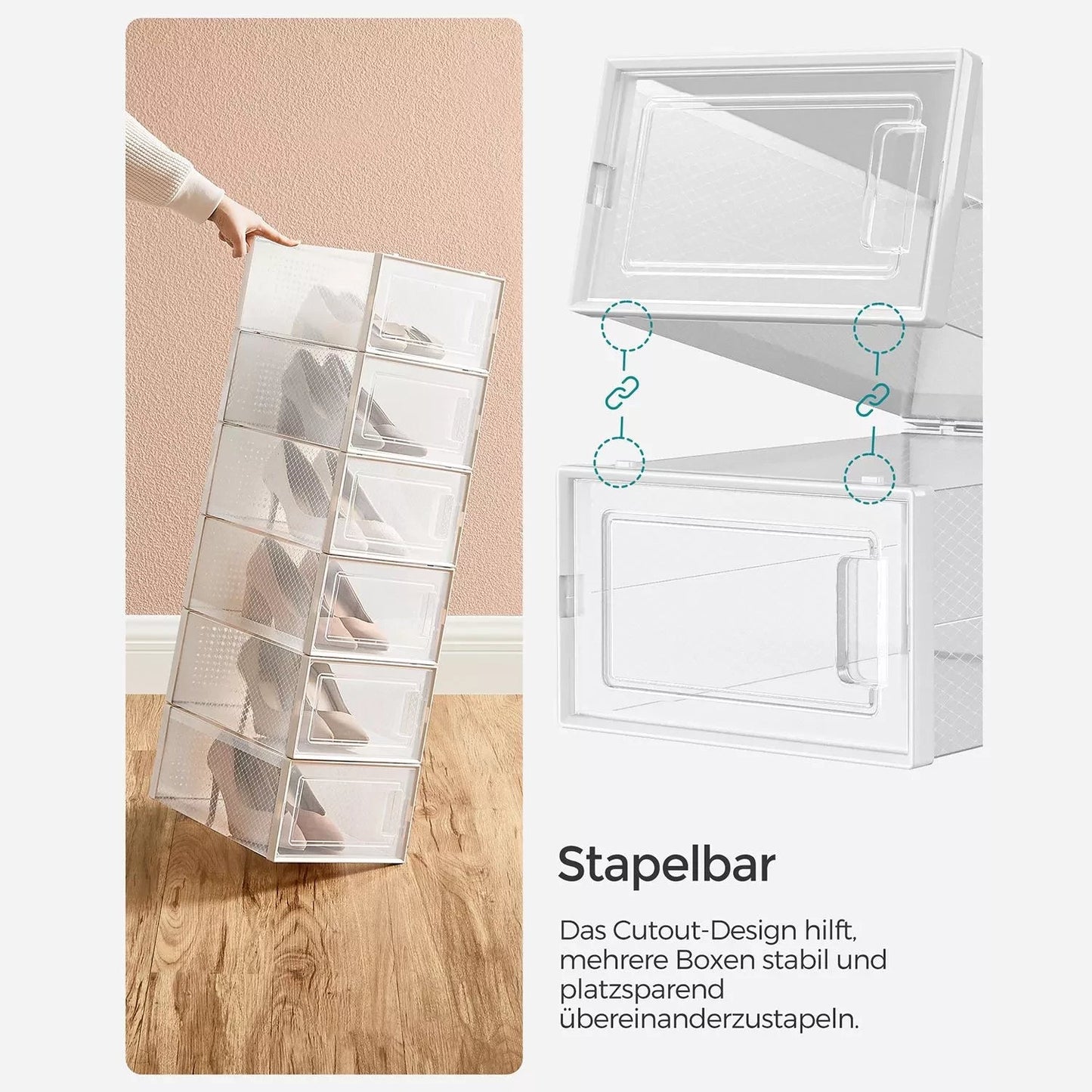 Keine chaotischen Schuhstapel mehr: Werfen Sie Ihre Schuhe jedes Mal einfach in den Schrank, sodass nach einer Weile ein chaotischer Schuhstapel entsteht? Befreien Sie sich von dieser schlechten Angewohnheit! Kaufen Sie diese 12 Schuhkartons und bewahren Sie alle Ihre Schuhe sauber und ordentlich auf, bis Sie sie das nächste Mal tragen. Schuhe effizient organisieren: Alle Schuhe bis Größe 44 passen in diese Boxen und können staubfrei gelagert werden. Brauchen Sie weiße Sandalen? Finden Sie sie auf einen Blick, öffnen Sie die Tür jeder Box und entnehmen Sie Ihre Schuhe ganz einfach. Perfekt, wenn Sie es morgens eilig haben! Noch besser ist jedoch, dass mehrere dieser Boxen platzsparend übereinander gestapelt werden können und sich somit hervorragend für Ihren Flur, Ihre Garderobe oder Ihr Lagerregal eignen. Produktdetails: Farbe: transparent weiß Material: Korpus aus PP (Polypropylen), Tür aus PP (Polypropylen) Maße pro Box: 33,3 x 23 x 14 cm (L x B x H) Innenmaße pro Box: 30 x 22,5 x 13,5 cm (L x B x H) Gewicht: 3,5 kg Lieferumfang: 12 x Schuhkarton 1 x Anleitung Inand Outdoormatch Hinweise: Befolgen Sie die Montageschritte in der Anleitung und im Video, um das Produkt zusammenzubauen. Wenden Sie bei der Demontage auch keine Gewalt an. Bitte messen Sie Ihre Schuhe vor dem Kauf und prüfen Sie, ob sie in diese Schuhkartons passen.