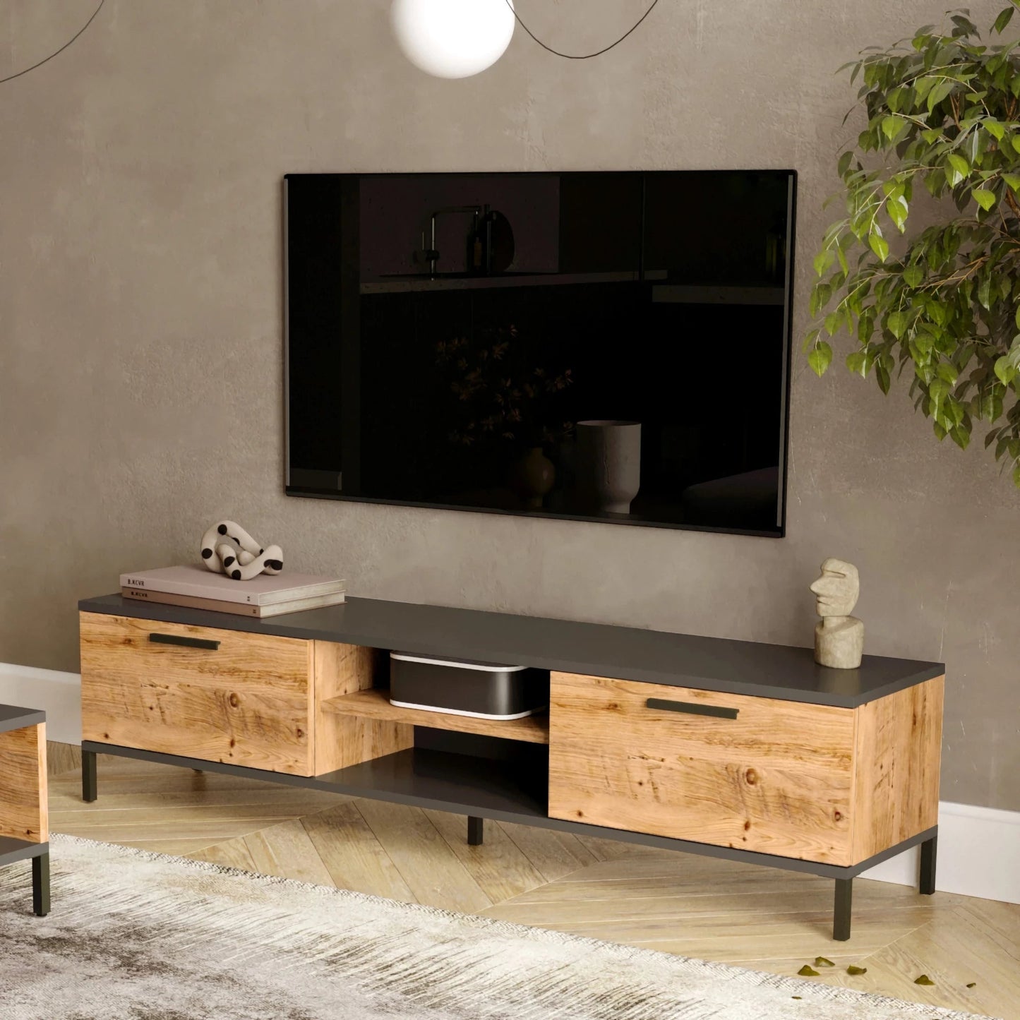 In And OutdoorMatch TV-Möbel Lucio – 160 x 35 x 39 cm – Holzfarbe und Anthrazit – Spanplatte und Stahl – stilvolles Design