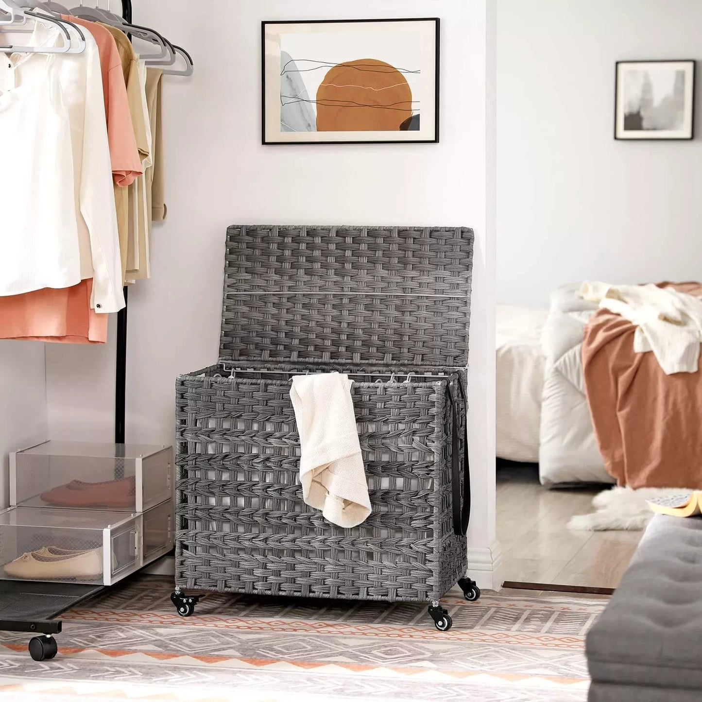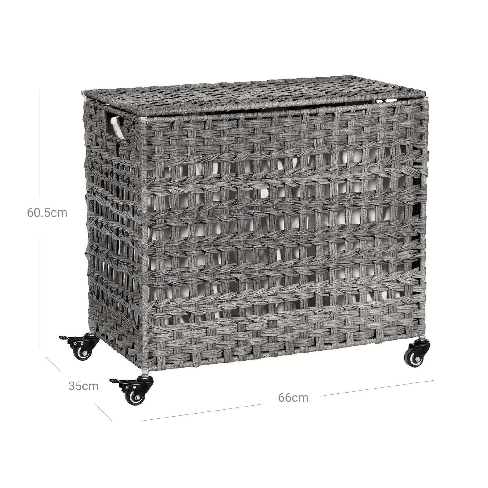 Ein aufgeräumtes Zuhause ist ein glückliches Zuhause: Es ist natürlich sehr nützlich, die schmutzige Wäsche nach dem Herausnehmen einfach auf den Boden zu werfen. Dadurch wird Ihr Zuhause nicht nur chaotischer, es macht es auch lästig, am Waschtag Ihre schmutzige Wäsche abzuholen. Warum probieren Sie nicht diesen Wachssammler aus? Es verfügt über 3 Fächer und ist zusätzlich mit einem Deckel ausgestattet. Dadurch können Sie Ihre Schmutzwäsche nicht nur sortiert aufbewahren, sondern auch versteckt aufbewahren. Folgende Vorteile erwarten Sie: Die handgewebte Oberfläche verleiht dieser Box eine besondere Optik. Unterstützt durch ein stabiles Metallgestell wird Sie dieser Wäschekorb jahrelang begleiten. Du kannst es benutzen. Bei Nichtgebrauch falten Sie den Korb zusammen und verstauen ihn platzsparend. Die 3 Taschen sind einzeln abnehmbar und zusätzlich mit Griffen ausgestattet. Nachdem Sie die Griffe entfernt haben, können Sie die Beutel in der Waschmaschine waschen. Die einfache Struktur dieser Box macht den Aufbau zum Kinderspiel. Dieser Wäschekorb passt perfekt in die Waschküche, das Schlafzimmer, das Badezimmer oder das Wohnzimmer. Produktdetails: Farbe: Grau Material: PP-Kunststoff (Polypropylen), Metallrahmen, Baumwolle Abmessungen: 66 x 35 x 60,5 cm (L x B x H) Gewicht: 5,4 kg Max. statische Belastbarkeit: 27 kg Lieferumfang: 1 x Wäschekorb 1 x Bedienungsanleitung (DE, EN, FR, ES, IT)
