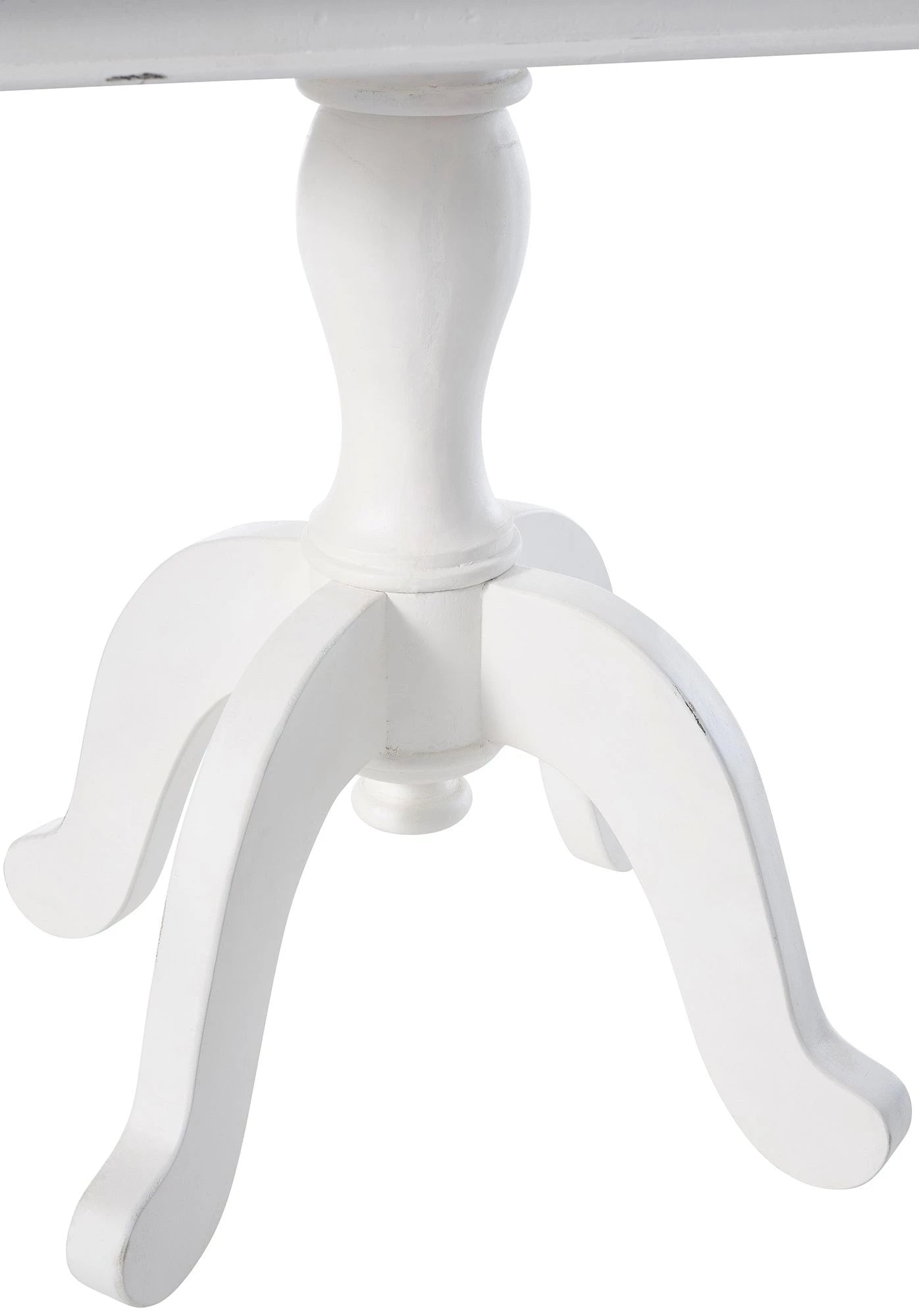 Der Tisch ist aus hochwertigem Mindi-Holz gefertigt und versprüht einen natürlichen Charme. Das Gestell im weißen Shabby-Chic-Stil verleiht ihm eine zeitlose Eleganz, während die geschwungenen Beine den Tisch zu einem Hingucker machen. Die charakteristische Holzmaserung der Tischplatte verleiht dem Küchentisch ein rustikales Aussehen.