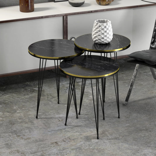 In And OutdoorMatch Side Table Nordin - Set of 3 - Round - Marble Black and Black - Chipboard and Metal - Stylish design