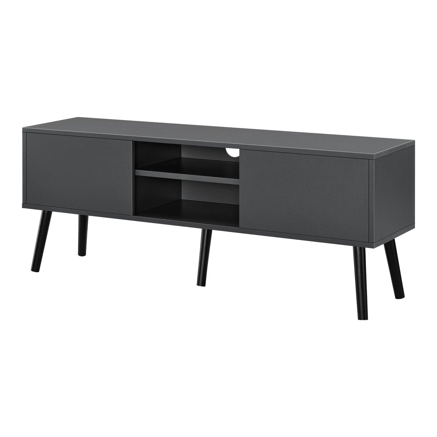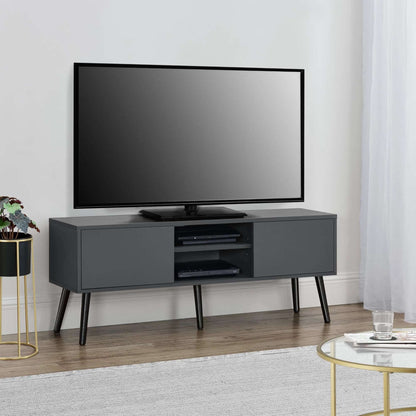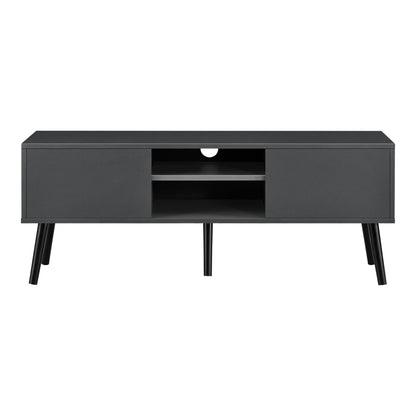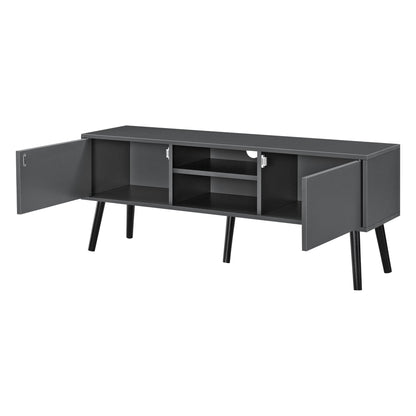 The modern and decorative TV cabinet has two doors and two open compartments in the middle for extra storage space.