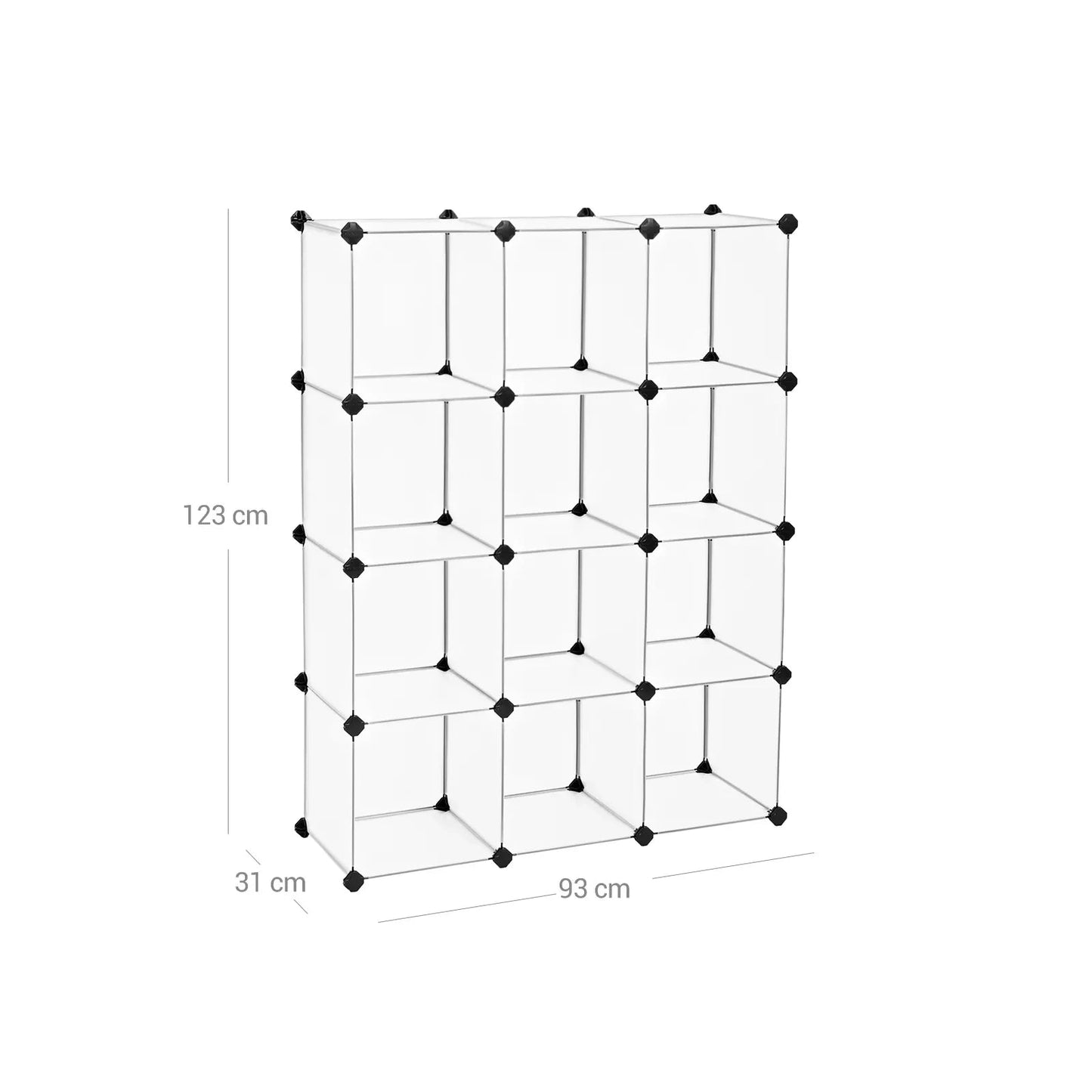 Staff! Too much clutter in my house! Here comes your salvation! With this multifunctional storage cabinet in semi-transparent white you can store all your small items in one place. This way you can quickly find the items you need, without having to search for a long time. Stability is a top priority: This storage unit consists of high-quality PP plastic sheets, ABS plastic connectors and iron wire frames, making it a stable storage option for your books, DVDs, shoes, etc. Endless possibilities are waiting to be implemented: this interlocking shelving system offers you a wide range of applications. You can put the cubes together the way you need them, so that the organizer optimally adapts to the space you have. Thanks to its simple and modern design, this shoe cabinet is also very suitable for your living room, garage or basement. Product details: Color: Semi-transparent white Material: PP plastic panels with metal wire frame, ABS plastic connectors Dimensions: 93 x 31 x 123 cm (L x W x H) Weight: 6.5 kg Max. Load capacity per cube: 10 kgUniversal shelf: The shelf is available in different configurations as desired. Let your creativity run wild. High Quality Plastic Connectors: Made of thickened ABS plastic, ensure long service life; 8 internally threaded slots increase the friction force between the plates and connectors to keep them firmly together. Seamless design: The slightly curved design on the 4 corners of the metal edge ensures that the connectors and plates are connected extra tightly, so that dust or insects cannot pass through. Extra safety: Each InAndOutdoormatch plug-in system is equipped with tip-over protection, so that you can anchor the plug-in shelf to the wall. Scope of delivery: 43 x plastic plate in semi-transparent white (30 x 30 cm) 46 x ABS plastic connectors in black 1 x rubber hammer 2 x tip-over protection 1 x manual (DE, EN, FR, ES, IT) Inand Outdoormatch Notes: The product must not come into contact with sharp objects. Also keep it away from sources of ignition. Do not sit on the product. Do not leave the product outside for long periods of time to prevent damage from the weather. All plastic panels must be pressed down completely during installation. After completing each row, check that the wire frames are pushed all the way into the connector to increase the stability of the product.
