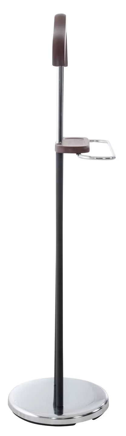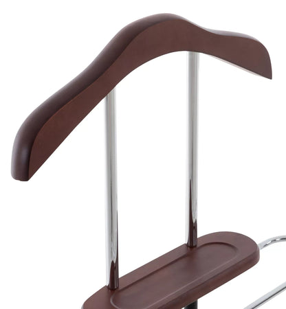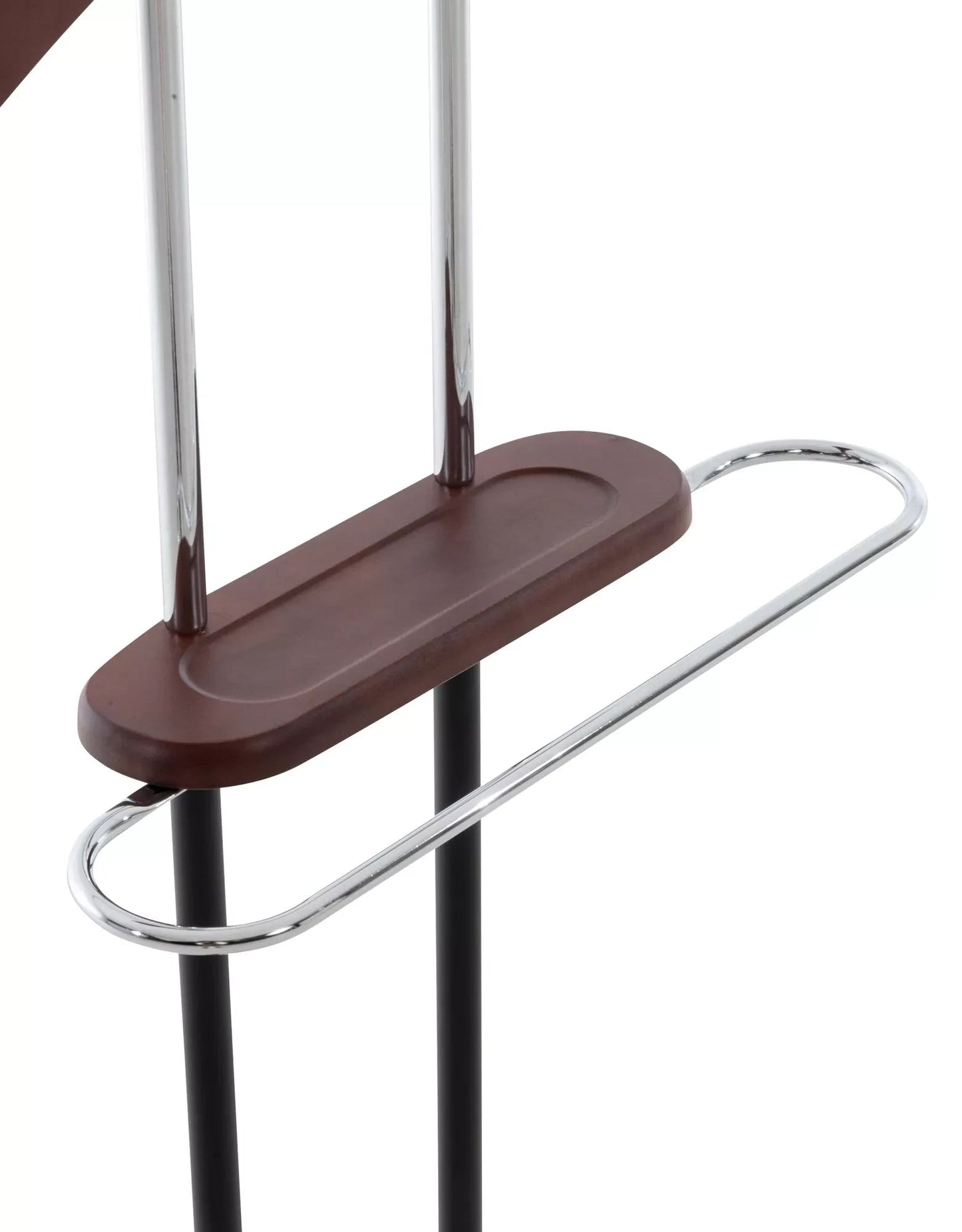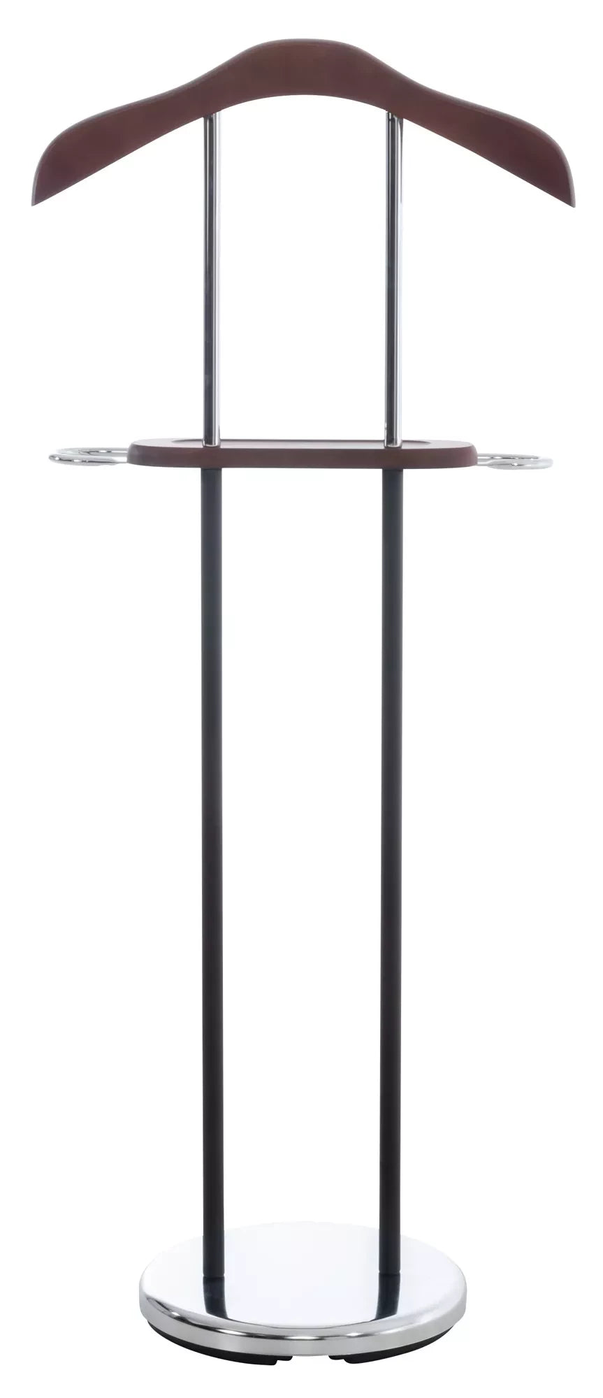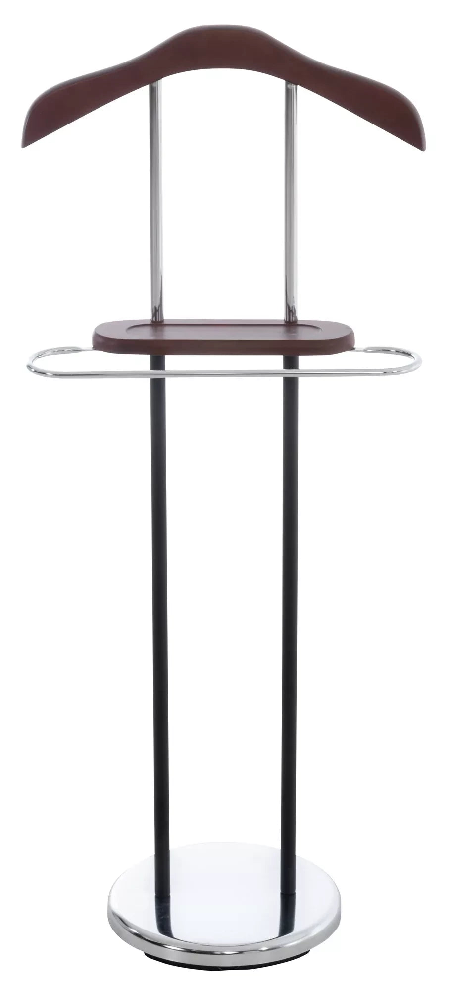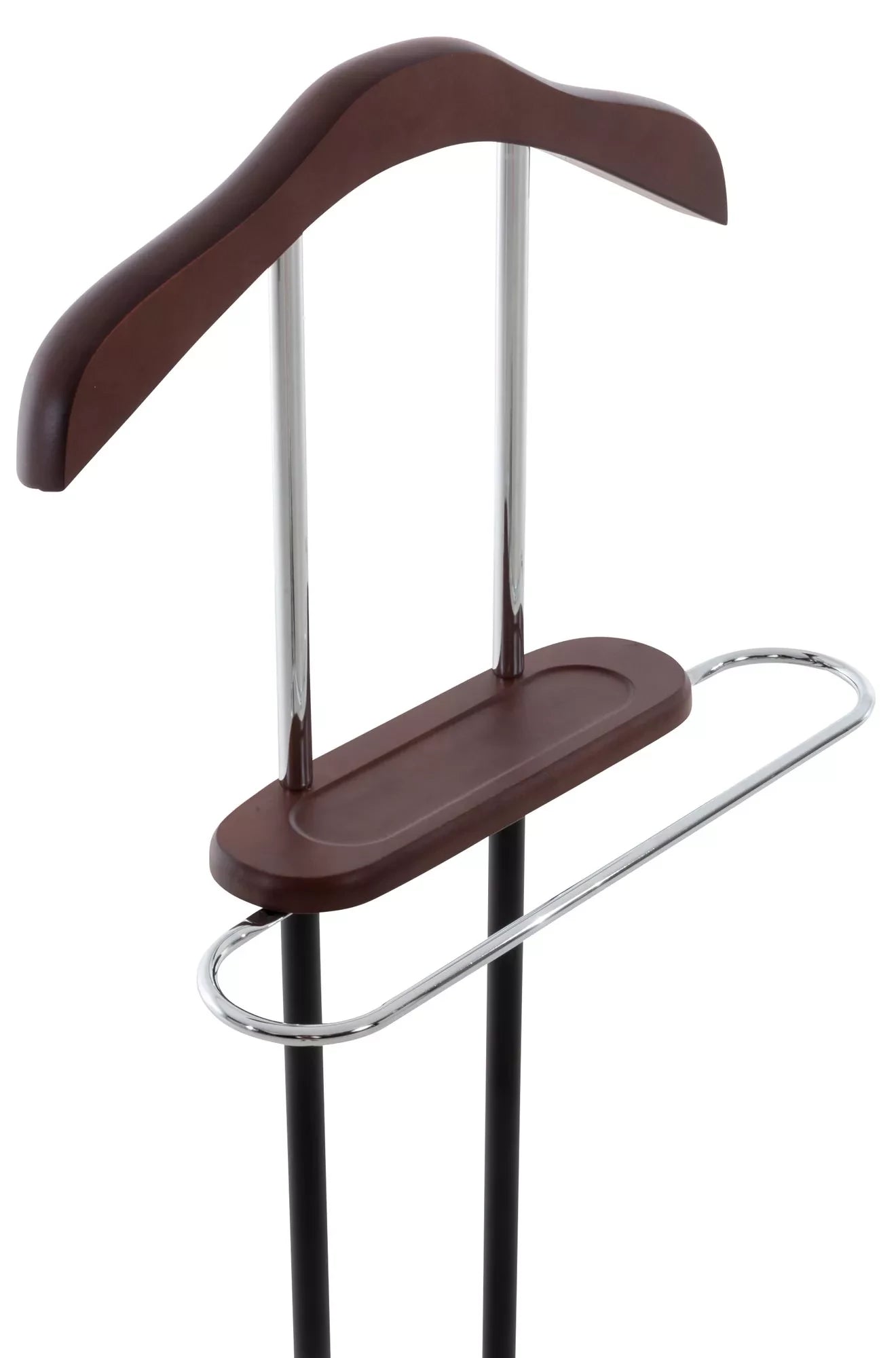 This unisex valet always looks good and fits in every dressing room, bedroom and guest room. The clothing stand is made of metal with a chrome finish and is available in different wood colors. Here you can prepare your clothes for the day in a space-saving and practical way. The heavy base ensures good stability. Thanks to the integrated clothes hanger and a trouser rail, the wardrobe can be stored wrinkle-free. Cufflinks, jewelry and the like can be placed on the practical shelf.