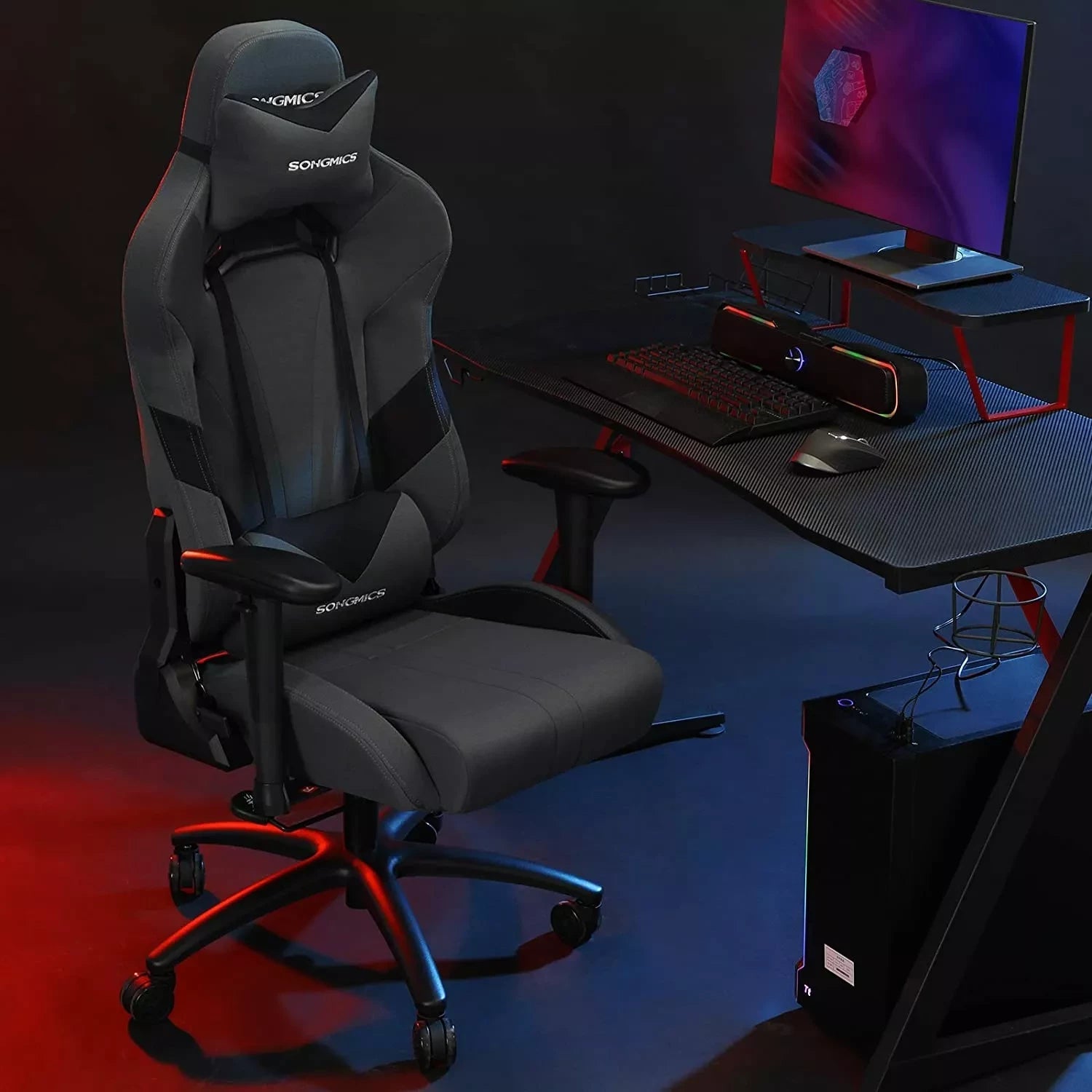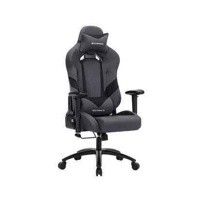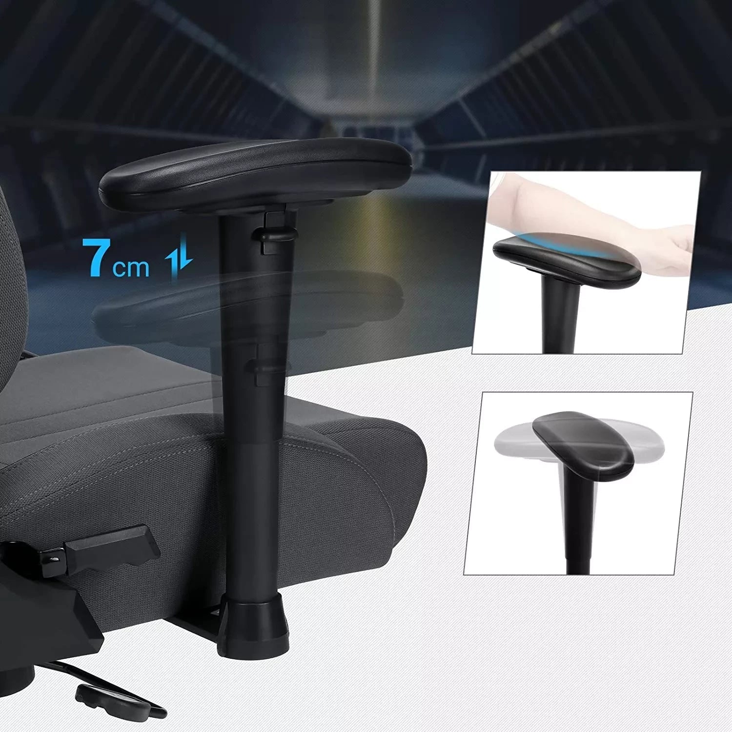 Product details: Color: gray-black Material: cover: polyester fabric cover: cold foam base: steel armrest axle: steel armrest: PU wheels: nylon core with PU coating Dimensions: height (total): 129-139 cm width (total): 70 cm depth (total): 71 cm seat height: 48-58 cmHeight of the armrest (from the seat): 23-30 cmWeight: 20.5 kgMax. Static load capacity: 150 kg Package contents: 1 x gaming chair 1 x accessory pack 1 x manual In and Outdoor match Notes: Lean firmly against the backrest when you want to put it back upright, otherwise the backrest may jump forward abruptly.
