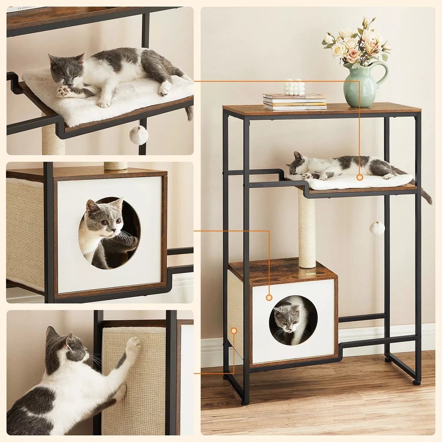 In the creative workshops, two cute kittens jump around, examine all scratching posts personally and give their animal feedback. In this way, the designers discover first-hand whether the products meet the requirements of spoiled whisker wearers. The highlights of this 2-in-1 cat furniture at a glance: - A large top shelf for storing your belongings. - Two soft pillows. - A platform and a cuddle cave for relaxing and hiding. - Sisal poles and a sisal mat on the side for the cats to sharpen their claws. - Only screws are required for installation. -Each screw comes with a spare. - The steel frame and adjustable legs provide stability. Product details: - Color: vintage brown - Material: chipboard, steel, plush, sisal - Total dimensions: 74 x 34 x 114 cm (L x W x H) - Cave size: 46 x 34 x 36 cm (L x W x H) ) - Dimensions of the sisal mat: 31 x 30 cm (L x W) - Weight: 12.8 kg Scope of delivery: - 1 x scratching post - 1 x accessory package - 1 x anti-tipping box - 1 x manual Notes: - If your cats chew the pillow, remove it immediately. - If the cat house is damaged, please repair or replace it in time to avoid injury from damaged parts. - Please attach this product to the wall with the attached anti-tip to ensure safe use.