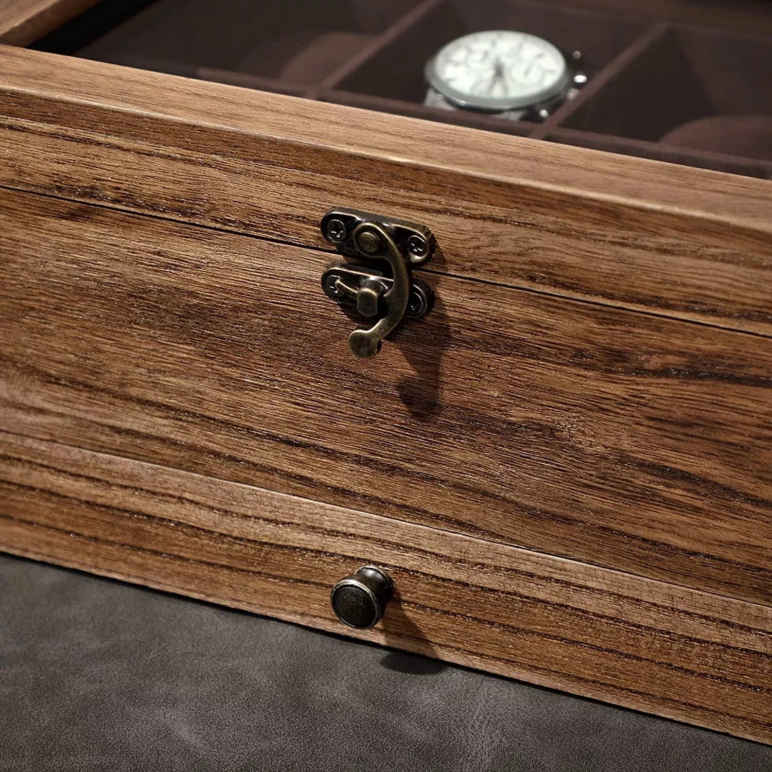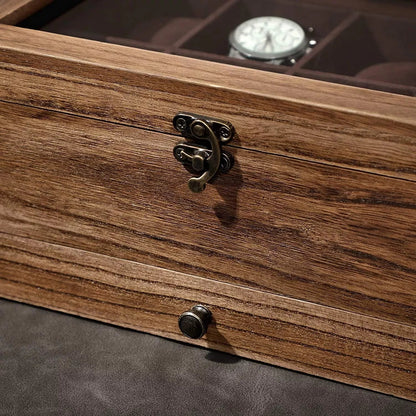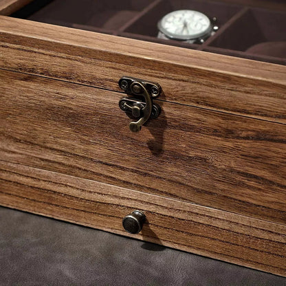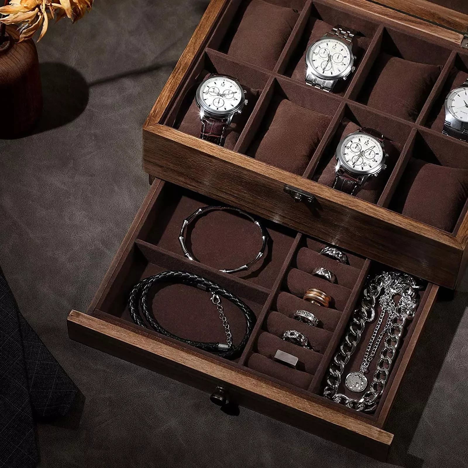 APPEARANCE: Whether sporty and casual, or classic and elegant, your watches deserve a tasteful home. With its rustic wooden charm, this watch case looks discreet, so it doesn't steal the attention from your jewelry. CONTENTS: Women's watches, quartz watches, digital watches... everything can be stored and protected in 8 compartments of 8 x 6 cm each. In the drawer below, rollers and slots await to welcome your rings and other jewelry home. SAFE STORE: Not only professional watch collectors need a high-quality watch case. The solid wood box, soft cushions and velvet lining ensure your treasures will remain safe and comfortable for years to come. Would you like an overview of your watch collection instead of looking for the right watch early in the morning? Also translucent for Eco-Drive and solar watches - the practical glass lid offers many advantages. DIMENSIONS: 27 x 20 x 13 cm