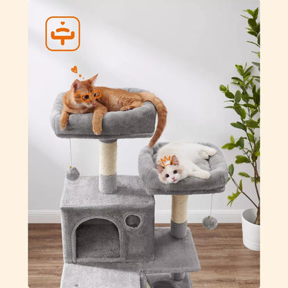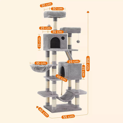 High-quality materials, a reinforced bottom and anti-tilt protection provide a stable and safe surface so that your cats can play safely. The entire scratching post is covered with soft plush, which provides a cozy feeling. With 2 pompoms, a play rope, 2 caves, a basket and a hammock, your cats will never be bored on this scratching post. 13 scratching posts and 1 scratching board entertain those restless claws and prevent them from ruining your furniture. Also suitable for kittens and older cats. Both the multi-level design and the ramp make it easier to climb up and down.