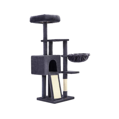In the creative workshop of InAndOutdoor Match, two little cats jump around, personally examine our scratching posts and provide animal feedback. FEANDREA's designers know firsthand which products meet the needs of our precious kittens. Why should you choose this multi-tiered cat tree? - Kitty and senior cat friendly: Both the multi-level design and the ramp make it easy to get in and out. - Soft and comfortable: The soft plush cover creates a relaxing atmosphere. - Various fun games: 1 perch for bird watching, 1 cave for hiding, 1 basket for resting and 1 post and board for training. - Easy to Clean: The top perch has a removable cover for easy cleaning. - Easy assembly: With labeled parts, clear instructions and an assembly tool, it is quick and easy to assemble by one person. Product details: - Color: Dark gray - Material: chipboard, plush, sisal - Dimensions: 46 x 41 x 135 cm (L x W x H) - Weight: 10.4 kg - Total static load capacity: 40 kg Scope of delivery: - 1 x scratching post for Cats - 1 x Tilt Protection - 1 x Accessory Pack - 1 x Manual Notes: - If the cat cave is scratched and damaged by bad paws, please repair or replace it before further use to avoid the risk of hurting your furry friend. - Since cats like to jump and play, mount the product on the wall with the included anti-tipper to keep it safe to use.