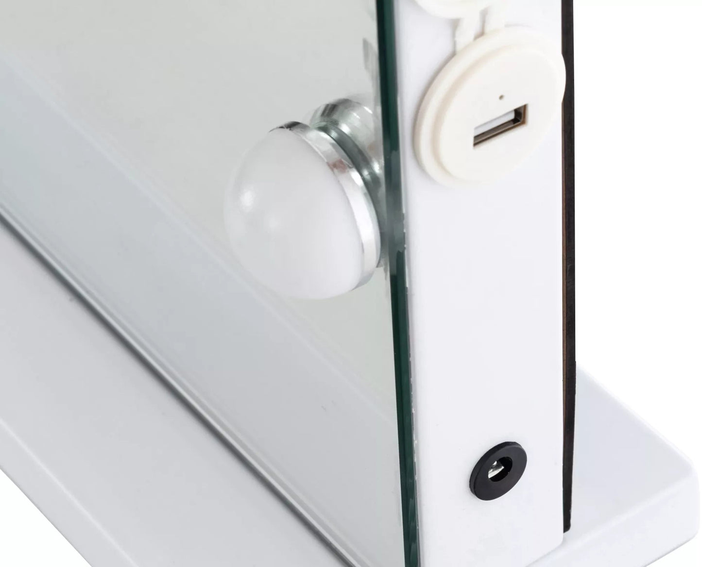The make-up mirror is equipped with 15 energy-saving LED lights all around. This makes optimal lighting possible. Easy operation thanks to the touchscreen control. For perfect light control, you can choose from three different light modes: warm white, neutral white or cold white and the LED lamps are dimmable. Thanks to the smart memory function, the mirror remembers which settings were last used. Furthermore, the mirror has a USB port on the side and allows charging of smartphones or other USB devices. The base of the mirror is removable and can then be mounted on the wall with the brackets at the back. A stylish Hollywood mirror that enhances the atmosphere in a stylish way.