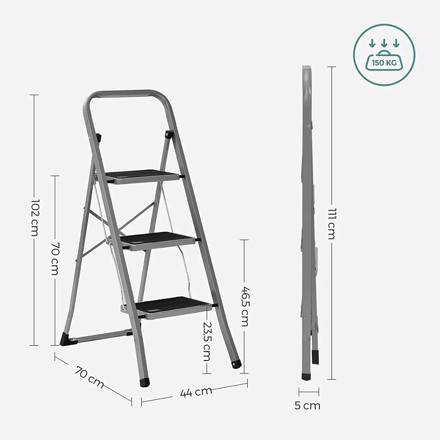High stability and safety A ladder should give you a feeling of safety. That is why we offer you these sturdy stairs. It is made of high-quality steel and can carry a load of up to 150 kg. In addition, the 20 cm wide steps with non-slip rubber mats and the non-slip feet with rubber coating provide more stability. Do you want even more certainty? Hold on to the handy handrail! A safe working environment keeps you focused. Well thought out down to the smallest detail. The folding ladder measures only 46.5 x 4.5 x 117 cm when folded and therefore fits perfectly in a corner of your garage or in the trunk of your car. In addition, it weighs only 5.5 kg and is equipped with a carrying handle so that you can easily transport the ladder from the basement to the garden to prune branches. In addition, the ladder has no sharp edges and is equipped with rounded corners and rubber caps, which ensures safe use. Product details: - Color: gray black - Material: steel - Dimensions folded: 46.5 x 4.5 x 117 cm (L x W x H) - Dimensions unfolded: 46.5 x 74.5 x 105 cm (L x W x H) - Size steps: 30 x 20 cm - Weight: 5.5 kg - Max. static load capacity: 150 kg Scope of delivery: - 1 x ladder with 3 steps - 1 x manual Inand Outdoormatch Notes: - Be careful when folding the ladder to avoid pinching your fingers. - Use the product on a flat surface. - Please do not use the ladder if there is oil or water on the ground. - Before using the ladder, check whether the safety device is automatically locked.