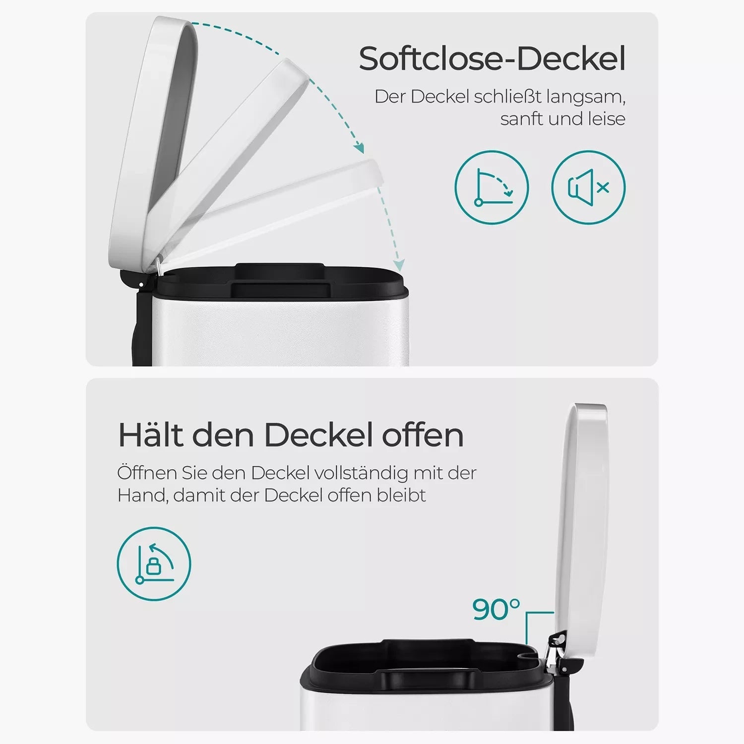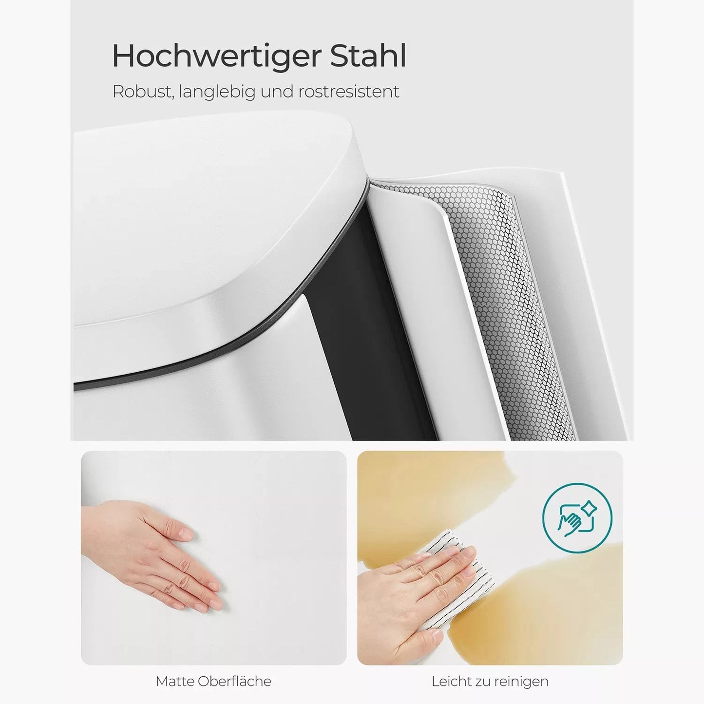 Recycling is also easy: this waste bin has a capacity of 30 liters and protects your family against bacteria and unpleasant odors thanks to the airtight seal. However, the best thing about this waste bin is that you don't have to touch it when disposing of waste, which ensures a high level of hygiene. Do your little ones often reach into the open container? If so, you want to put an end to it. This is where our pedal bin comes into the picture! The lid only opens when you step on the pedal. Thanks to the high-quality material and practical design, this waste bin offers a smart solution for waste disposal. Product details: Color: white Material: steel, plastic (inner bucket) Dimensions: 35 x 23.8 x 63 cm (L x W x H) Dimensions inner bucket: 35 x 23.5 x 57.5 cm (L x W x H) Total height (with open lid): 85.5 cm Weight: 3.8 kg Scope of delivery: 1 x waste bin Inand Outdoormatch Notes: To clean the product, wipe it with a soft, damp cloth and use mild if necessary cleaning products.