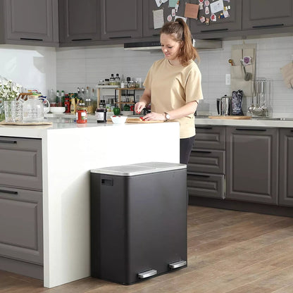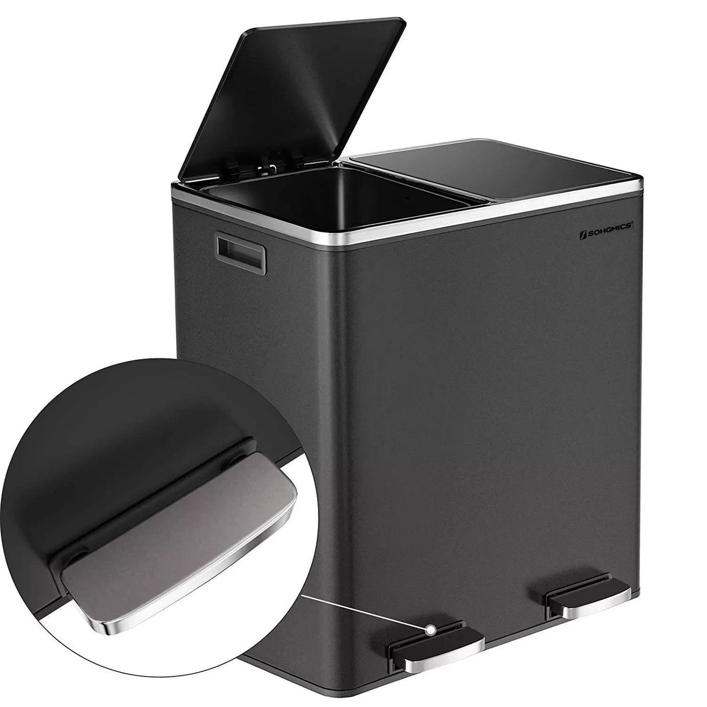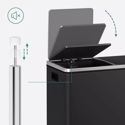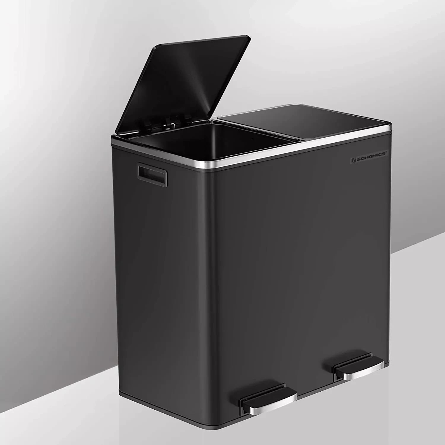 The waste bin is supplied with 2 inner buckets (30 L each for a 30 L garbage bag). The lid can be opened automatically by stepping on the attached stainless steel pedal. It is equipped with a buffer mechanism that ensures that the lid closes slowly and silently. Stainless steel container, not only perfect for the kitchen, but also ideal for the garage, workshop or study. Removable plastic inner buckets with chrome-plated handle, useful for removing waste. 65x58x32cm