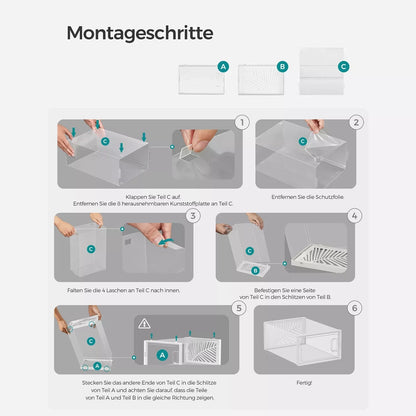 Product details: - Color: transparent white - Material: PET body, ABS frame - Dimensions per shoe box: 33.5 x 23 x 14 cm (D x W x H) - Inner dimensions per shoe box: 30 x 22.6 x 13, 5 cm (D x W x H) - Total weight: 4.6 kg Scope of delivery: - 12 x shoe box - 1 x Inand Outdoormatch instructions Notes: - Assemble the product strictly according to the instructions. - Pre-measure your shoes before purchasing and make sure they fit in these shoe boxes.