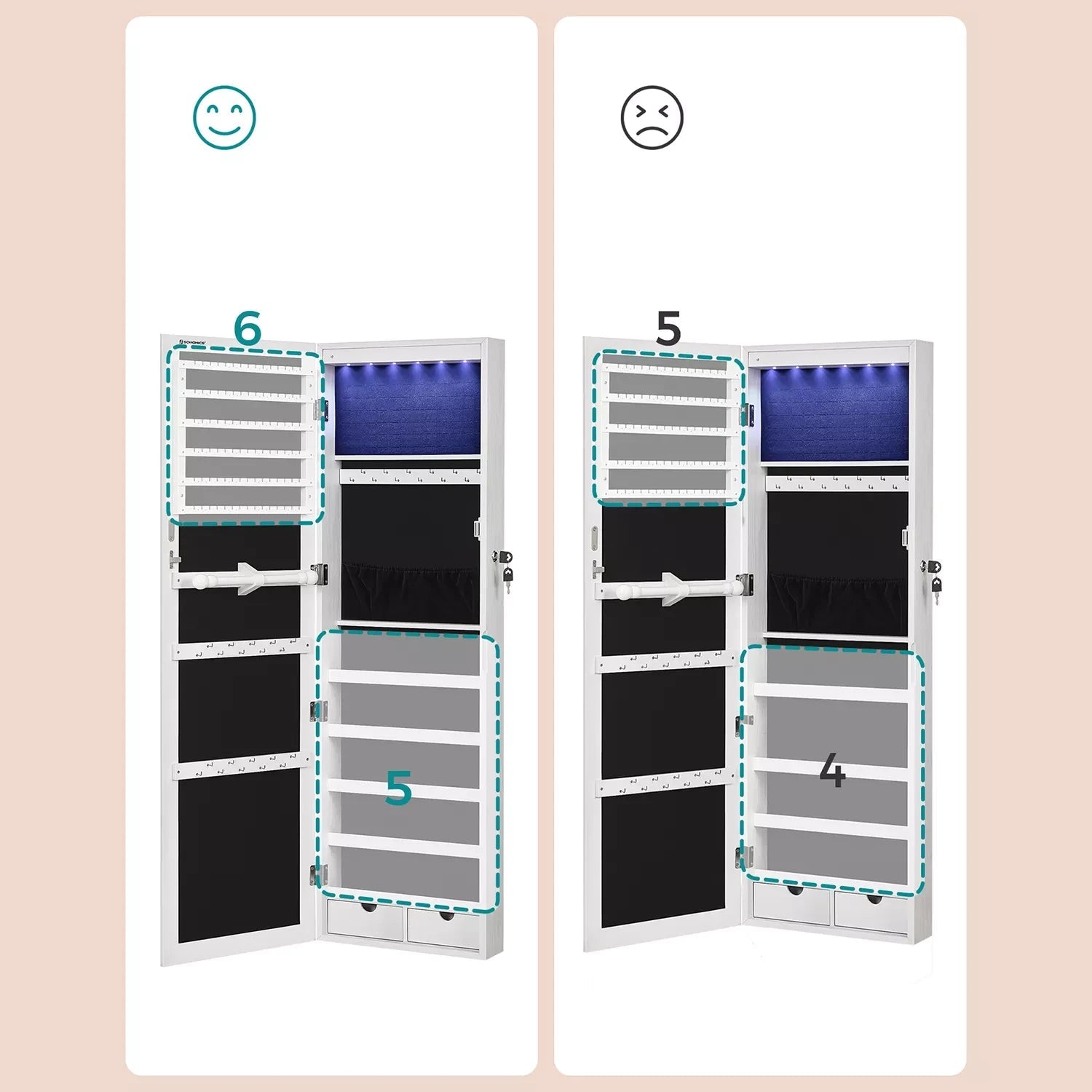 Her new red dress fits like a glove. Put on your heels and admire your outfit in the large mirror of this striking jewelry cabinet that you can hang on your bedroom door or mount on your wall. Stop! Something is still missing! Matching earrings and a glittering necklace complete your styling. Fortunately, you don't have to search long for the right jewelry, because they are neatly lined up behind the door of the mirror cabinet. The supplied door hooks are only suitable for normal doors. For German doors you must purchase the corresponding door hooks separately. Jewelry lovers expect the following benefits: Wide mirror without frame for a larger mirror surface Can be hung on the door frame or mounted on the wall 6 rows with 15 brackets each and 8 slots for earrings (total 90 brackets and 48 slots) 7 rows with 12 each slots for rings (total 84) 32 hooks for necklaces etc. 1 rod for scarves and neckerchiefs 5 shelves for perfume, nail polish etc. 2 drawers LED interior lighting Lockable Product details: Colour: white Material: MDF (medium density fibreboard) Total dimensions: 37 x 9 .3 x 108 cm (L x W x H) Weight: 9.1 kg Contents: 1 x hanging jewelry cabinet 1 x accessory pack 2 x normal door hook 1 x instructions InandOutdoormatch Notes: Keep children away from all accessories and packaging parts during assembly of this product. If these are swallowed or inhaled, life-threatening situations can arise.
