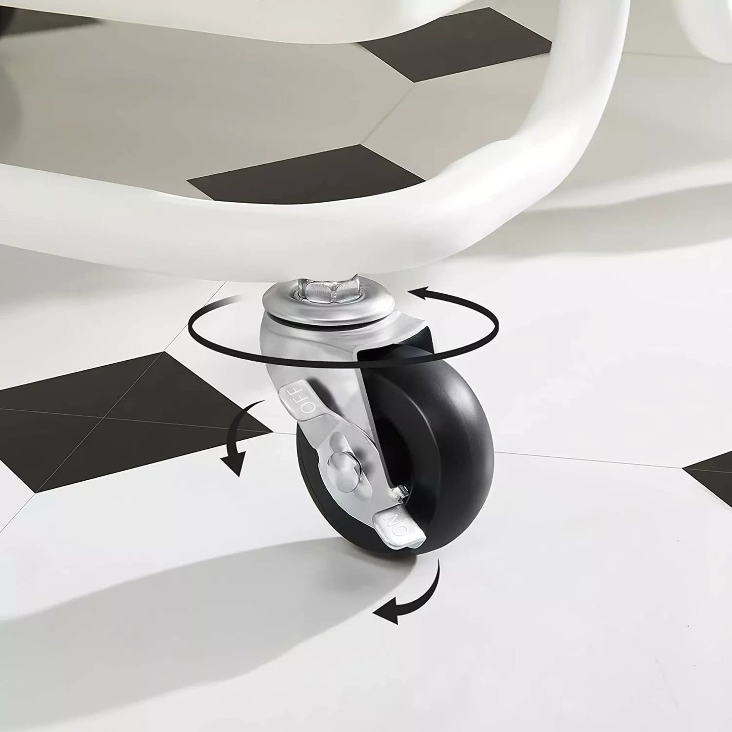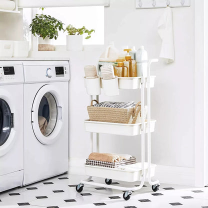Sturdy steel frame, 3 plastic storage compartments and 4 high-quality wheels (2 of which are lockable). Roll this shelf from Inand Outdoormatch to wherever you need more storage space. To the laundry room: Slide this shelf into the laundry room to store detergent, fabric softener, cleaning products, etc. for proper storage. Tomorrow is laundry day! But don't worry, all the kitchen utensils are already in the trolley and waiting to be used! In the kitchen: spices on the top shelf, fruit in the middle and vegetables on the bottom - everything has its place! You can finally free your work surfaces from chaos and use them wisely again. In the office: You can store your bread supplies on this shelf and thus create order on the desk. To be able to work productively, a tidy workplace is the most important thing! If your brother needs some greenery, you can place some small succulents on the top shelf of this shelf. Think outside the box! Endless applications await this trolley! Rolling out birthday presents as a surprise? store books? Or present small plants... What else? Various items fit in this serving trolley. Product details: Color: White Material: Steel, PP plastic Dimensions: 41.6 x 33.5 x 86.3 cm (L x W x H) Weight: 3 kg Max. Static load capacity per level: 10 kg Scope of delivery: 1 x trolley 2 x small hanging compartment 1 x accessory package 1 x manual (DE, EN, FR, ES, IT)