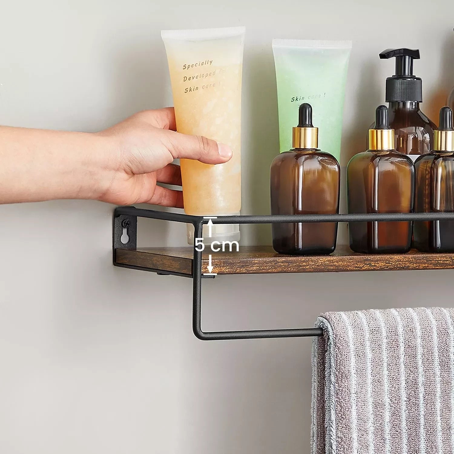 Product details: - Color: vintage brown black - Material: chipboard, steel - Small shelf dimensions: 40 x 15.5 x 5 cm (L x W x H) - Large shelf dimensions: 40 x 15.5 x 9.5 cm (L x W x H) - Total weight: 2 kg - Max. static load capacity of the shelf: 5 kg - Max. static load capacity of the bar: 10 kg Scope of delivery: - 2 x wall shelves - 1 x accessory package - 1 x manual Inand Outdoormatch Notes: - For safety reasons, children should not climb on or play with the product.