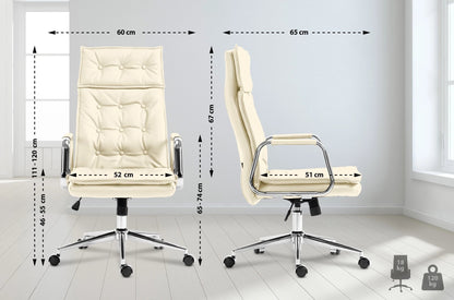 De exclusieve Franziska directiestoel is een bureaustoel met zeer hoogwaardige bekleding en een moderne uitstraling. De bekleding van echt leer in gebroken wit ziet er niet alleen prachtig uit, maar is ook bijzonder robuust en onderhoudsvriendelijk. Een stevig metalen frame met chroomlook zorgt bovendien voor een veilige stand. De zithoogte is traploos verstelbaar en garandeert urenlang ergonomisch zitten. Het ingebouwde wipmechanisme zorgt bovendien voor meer bewegingsvrijheid. De Franziska bureaustoel staat stevig op vijf soepel lopende wielen. Of het nu om harde vloeren of vloerbedekking gaat, u kunt altijd gemakkelijk en losjes over de vloer rollen.