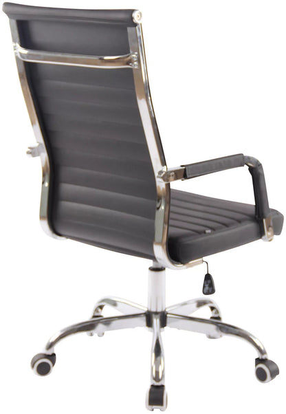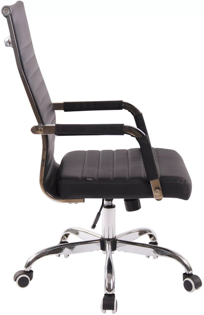 De Tito bureaustoel overtuigt niet alleen door zijn moderne uitstraling, ook op het gebied van comfort houdt niemand hem voor de gek. De hoogwaardige bekleding en de onderhoudsvriendelijke bekleding, zowel van kunstleer als van stof, zorgen ervoor dat u urenlang comfortabel zit. Bovendien is de zithoogte traploos verstelbaar, wat een ergonomische zit garandeert. Verder is de bureaustoel voorzien van een schommelmechanisme dat zorgt voor meer bewegingsvrijheid. De stabiliteit wordt gegarandeerd door het metalen frame met een chromen afwerking. Dankzij de vijf lichtlopende wielen rol je gemakkelijk en losjes over de vloer – of het nu op harde vloeren of tapijten is. Het elegante chroomframe en de stabiele, gebogen armleuningen geven het geheel net dat beetje extra en ronden het ontwerp af.