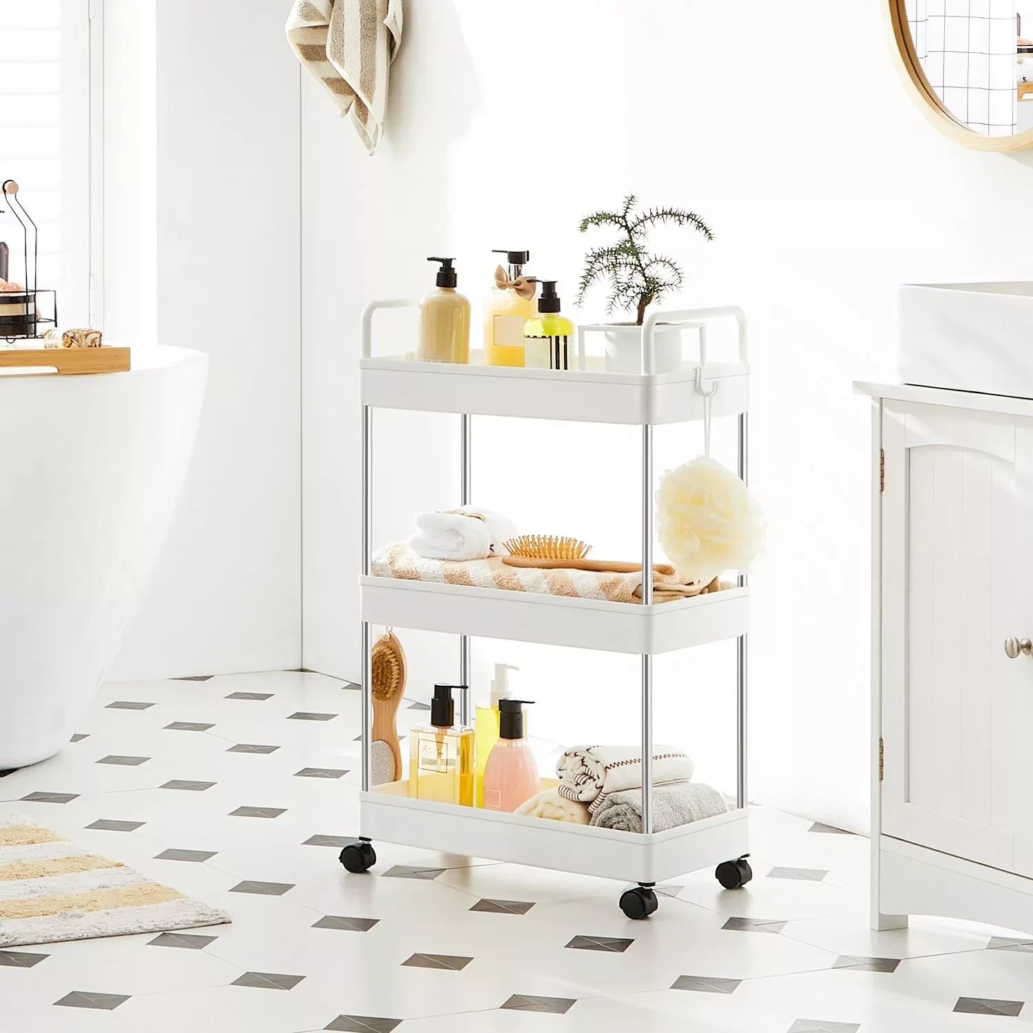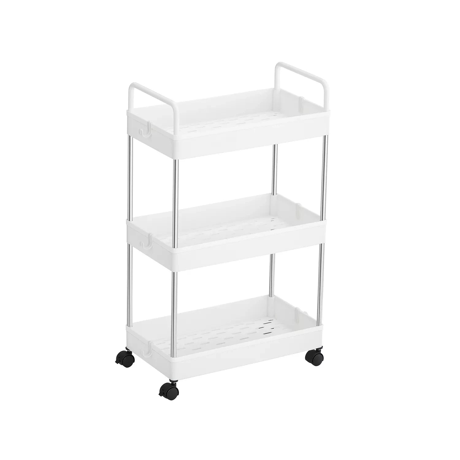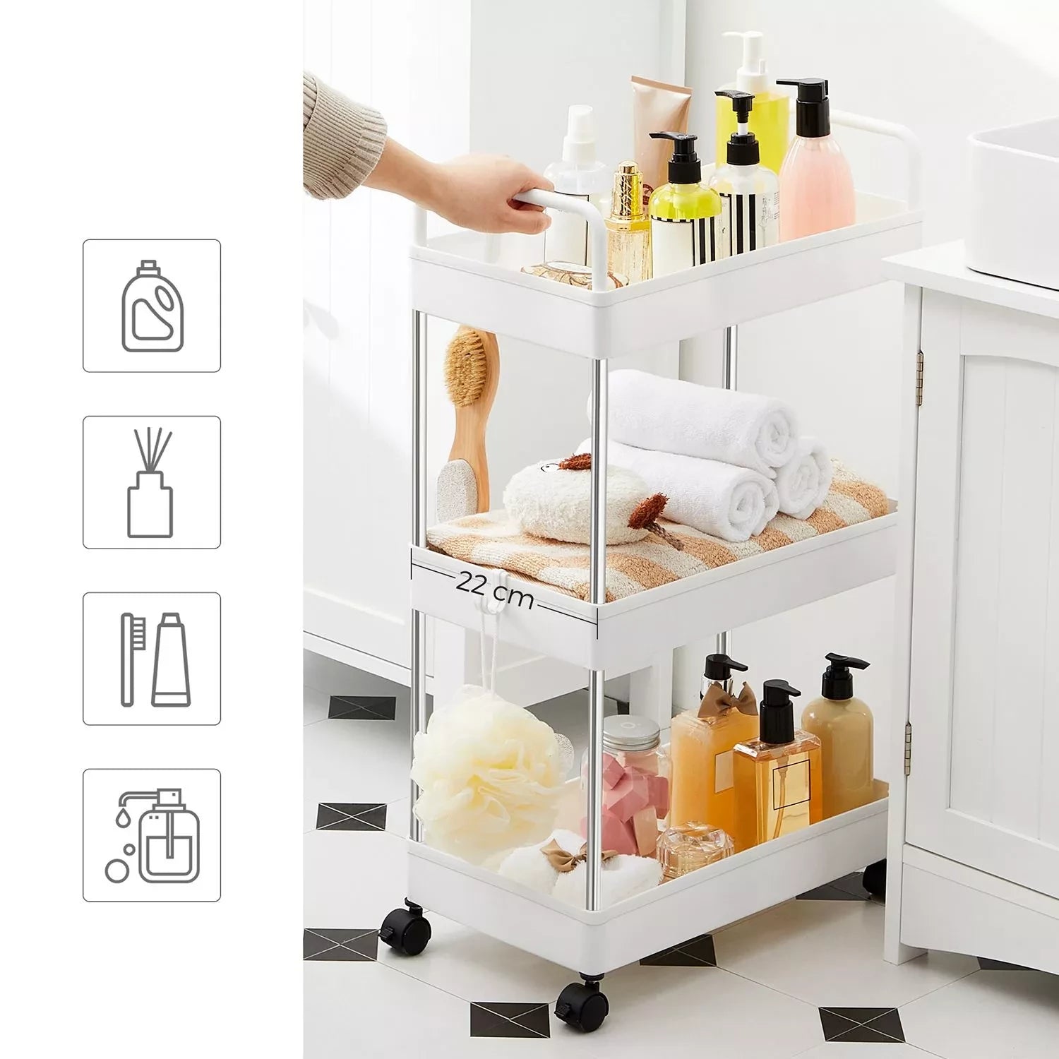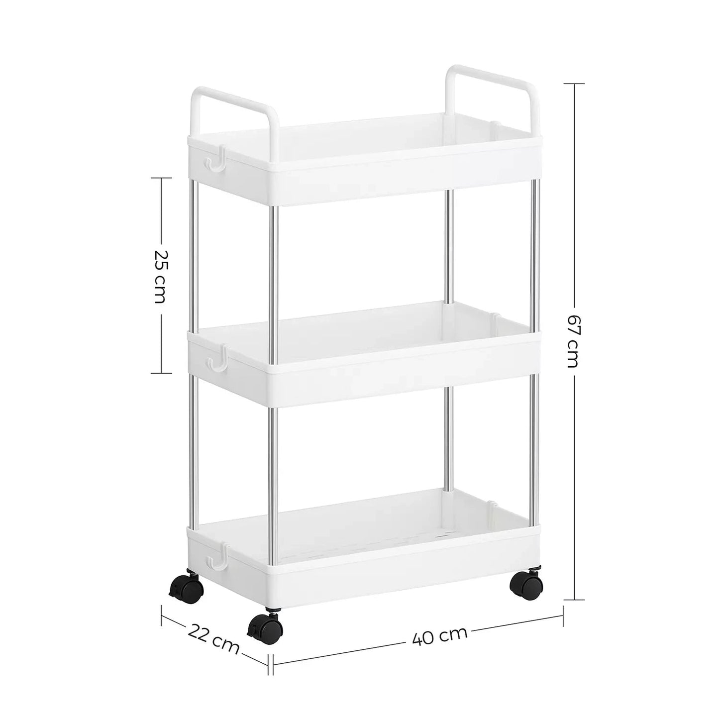 Productdetails: - Kleur: wit - Materiaal: roestvrij staal, PP (polypropyleen) - Totale afmetingen: 40 x 22 x 67 cm (L x B x H) - Gewicht: 1,2 kg - Max. statische belasting per niveau: 5 kg Leveringsomvang: - 1 x Trolley - 6 x Haken - 1 x Instructies Inand Outdoormatch Opmerkingen: - Bewaar zwaardere voorwerpen op de onderste plank en plaats of hang voorwerpen gelijkmatig op elk niveau om kantelen te voorkomen. - Gelieve druk bij het opzetten. Plaats uw handen niet direct op de uiteinden van de buizen om letsel te voorkomen.