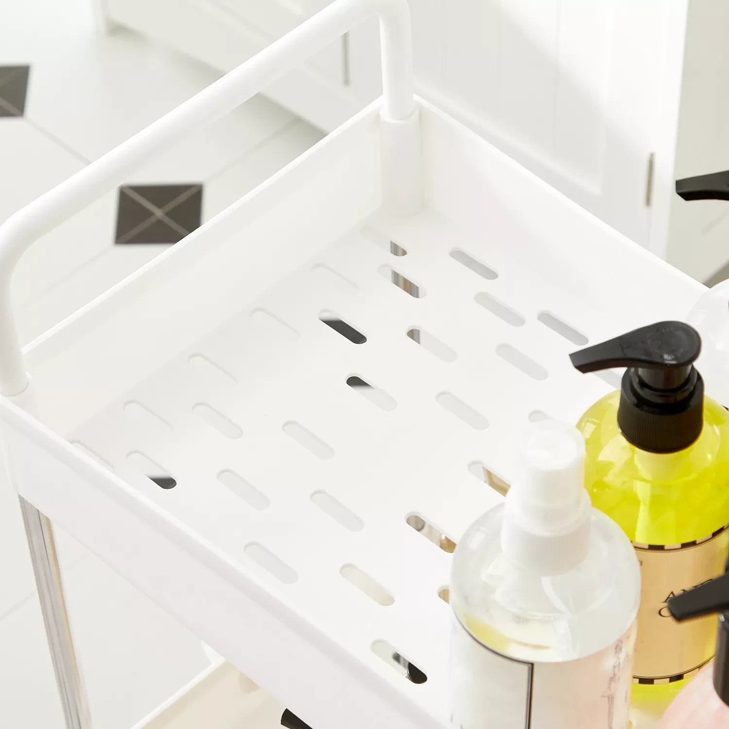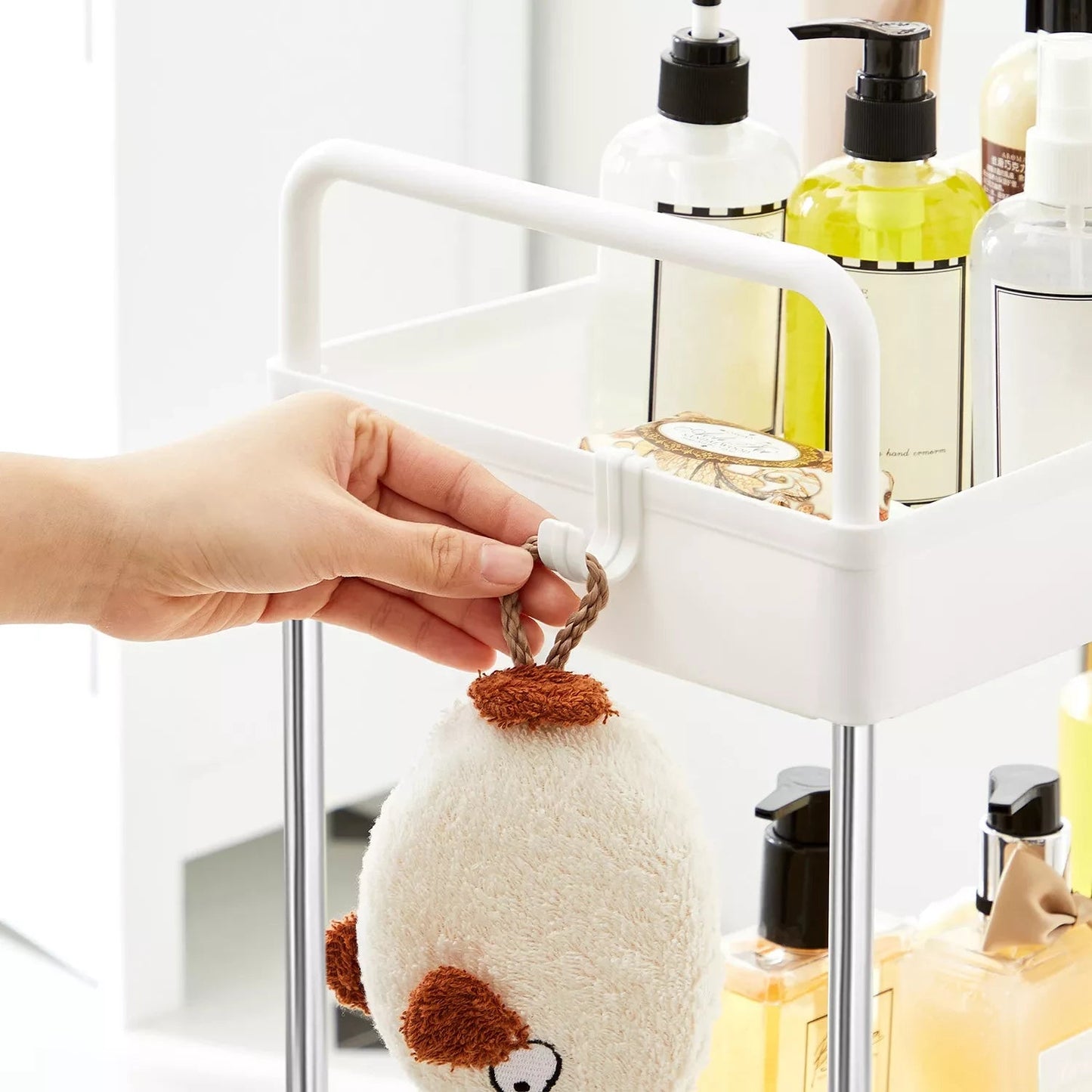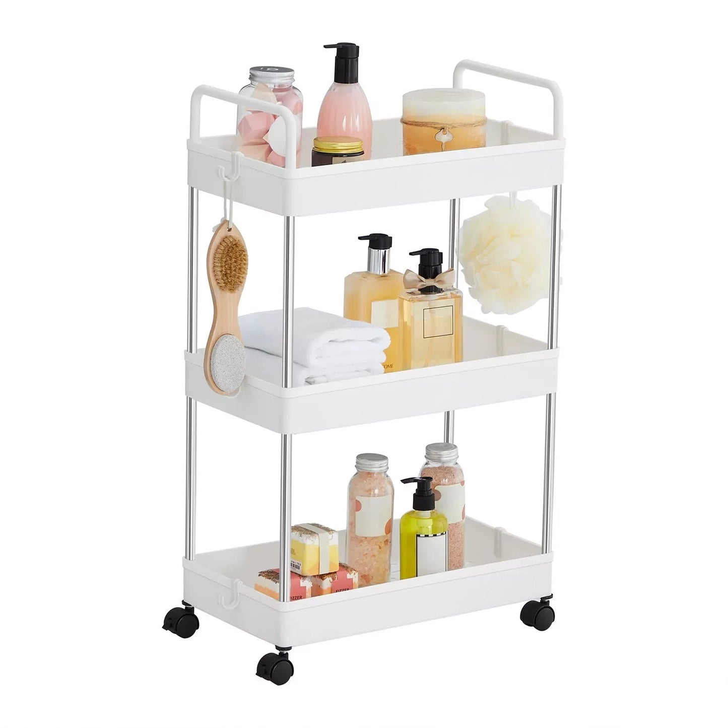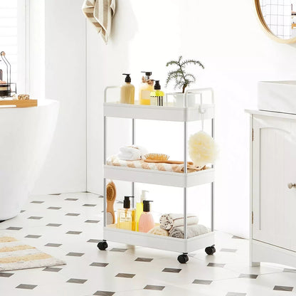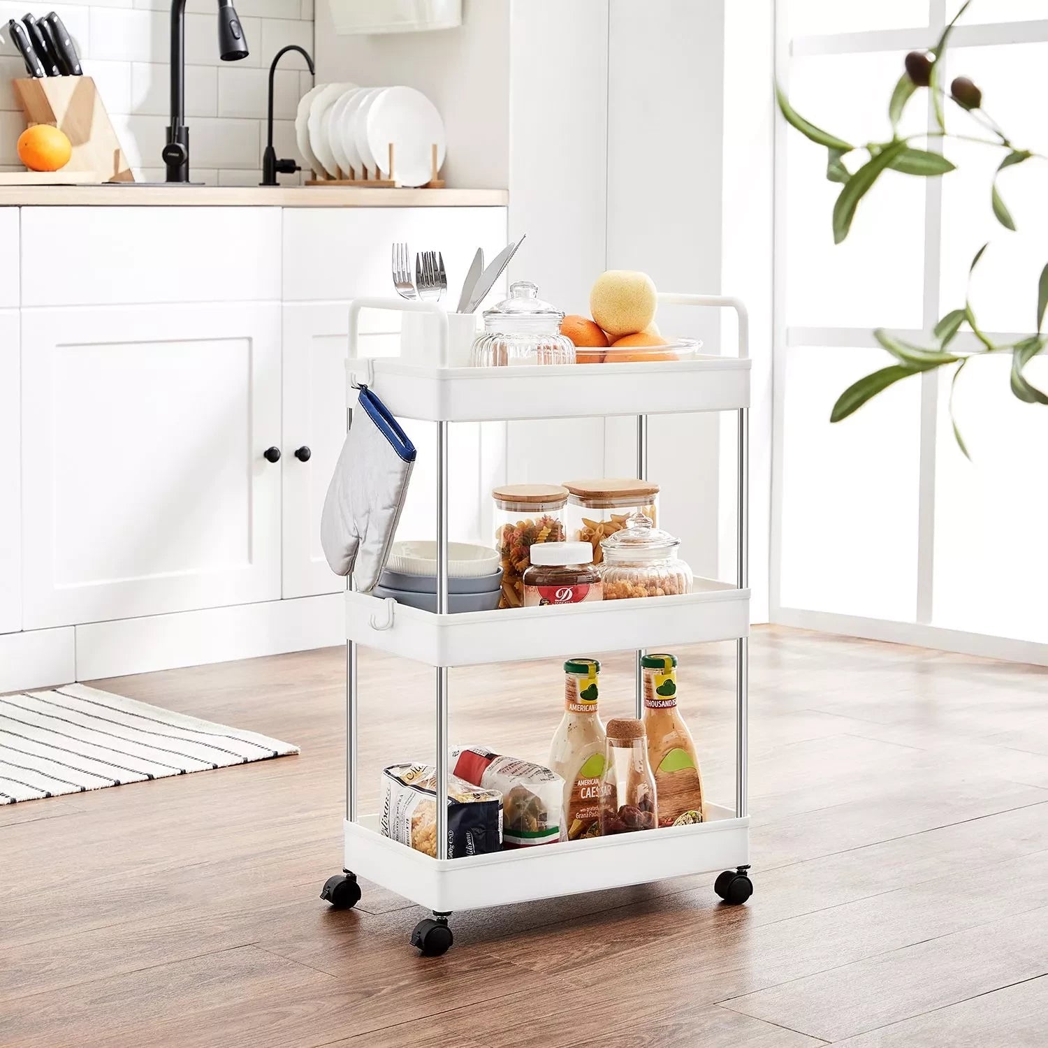 Productdetails: - Kleur: wit - Materiaal: roestvrij staal, PP (polypropyleen) - Totale afmetingen: 40 x 22 x 67 cm (L x B x H) - Gewicht: 1,2 kg - Max. statische belasting per niveau: 5 kg Leveringsomvang: - 1 x Trolley - 6 x Haken - 1 x Instructies Inand Outdoormatch Opmerkingen: - Bewaar zwaardere voorwerpen op de onderste plank en plaats of hang voorwerpen gelijkmatig op elk niveau om kantelen te voorkomen. - Gelieve druk bij het opzetten. Plaats uw handen niet direct op de uiteinden van de buizen om letsel te voorkomen.