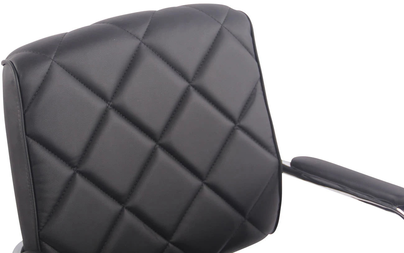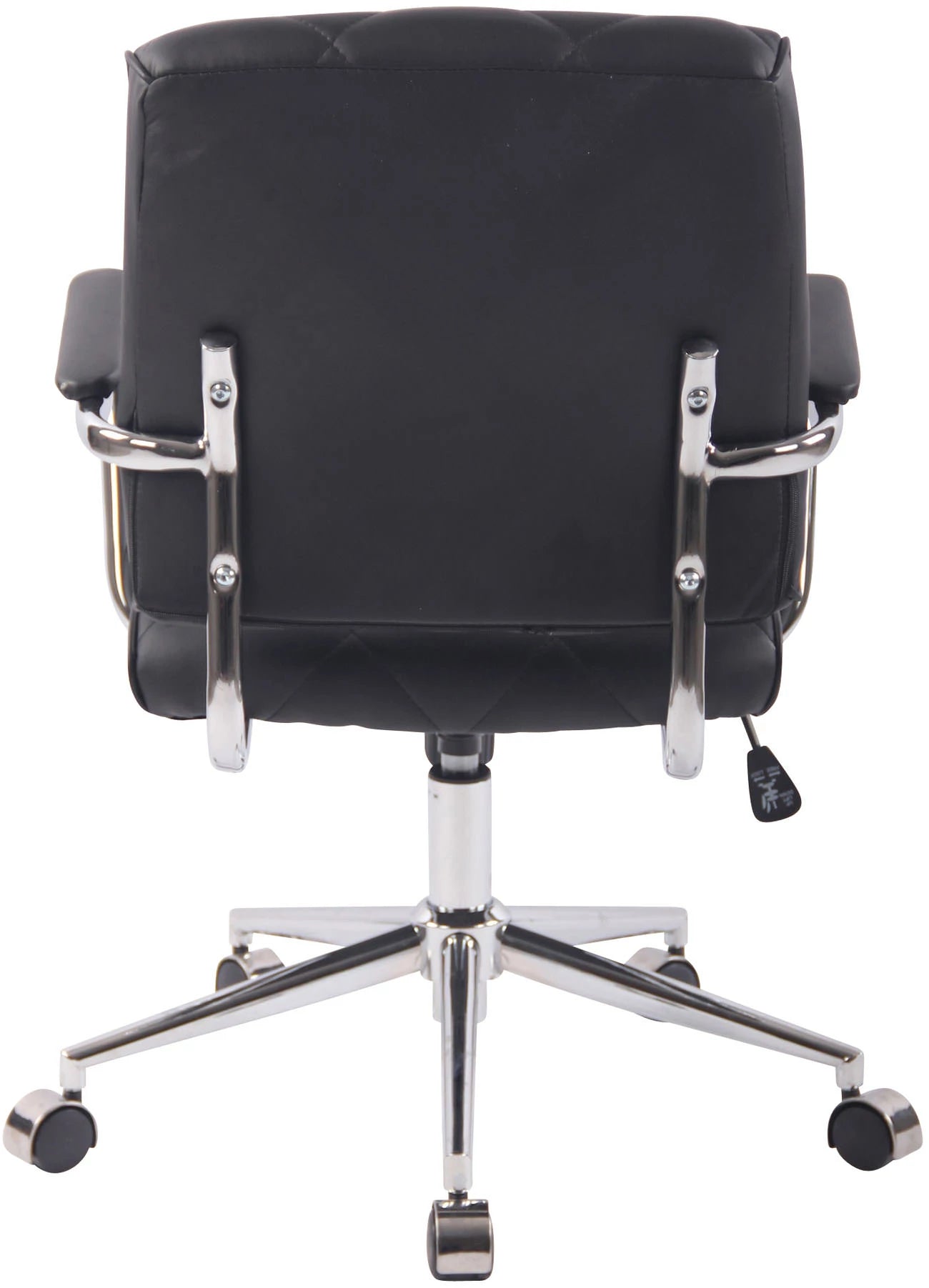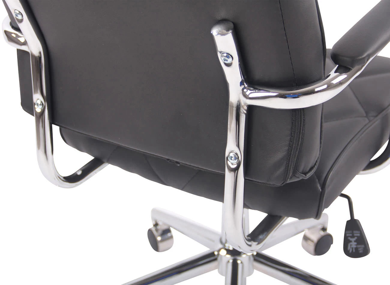 De Margitta bureaustoel overtuigt door zijn moderne design en biedt dankzij de rugleuning een hoog comfort tijdens het werken. Deze draaistoel heeft een zeer hoogwaardige bekleding en is bekleed met kunstleer. Het elegante chromen frame en de gecapitonneerde armleuningen met hoes geven het geheel net dat beetje extra. De traploze hoogteverstelling en het kantelmechanisme maken het mogelijk om meerdere uren comfortabel te zitten. De bureaustoel staat veilig op een chroomlook metalen frame met vijf lichtlopende wielen. Of het nu om harde vloeren of vloerbedekking gaat, u kunt altijd gemakkelijk en losjes over de vloer rollen.