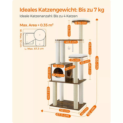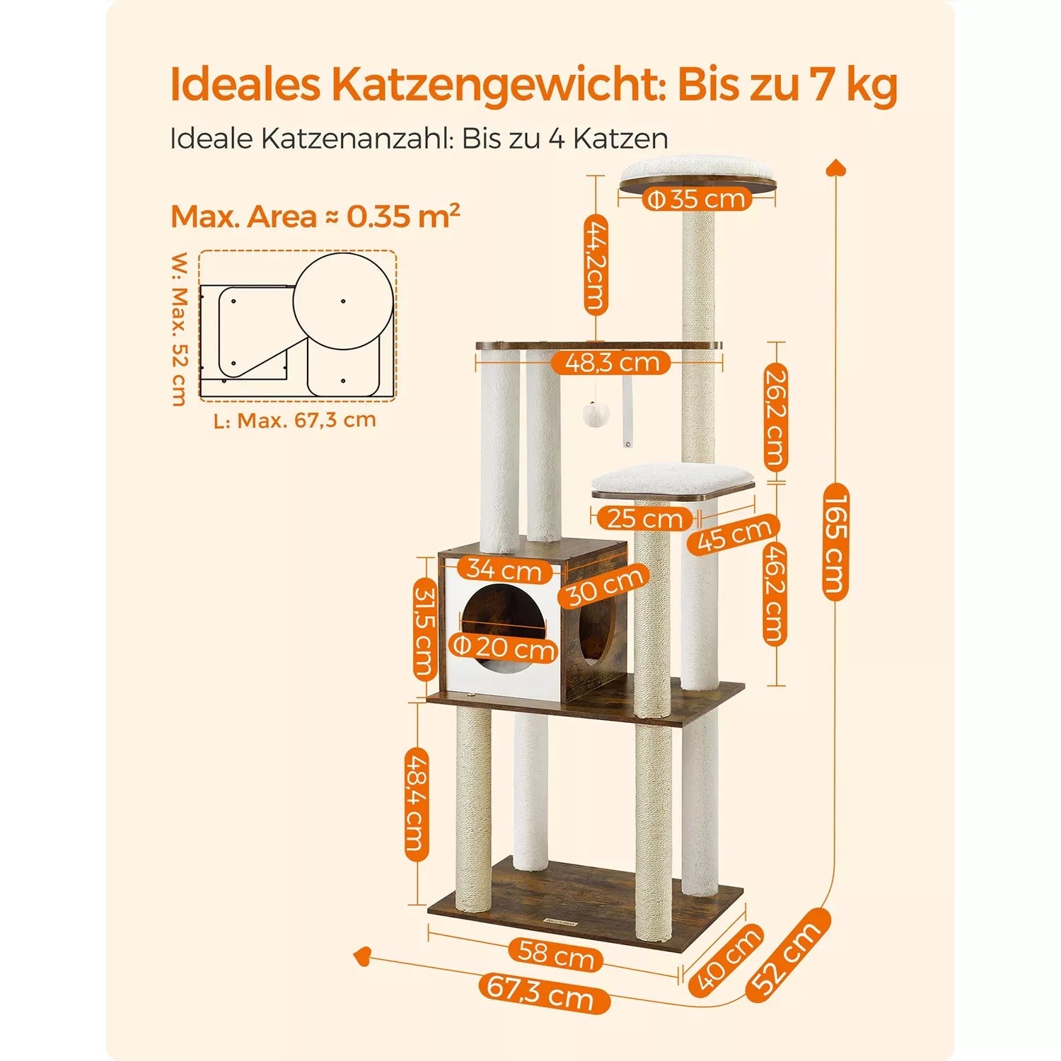 Productdetails: Kleur: vintage bruin Materiaal: spaanplaat, 500 g/m pluche, sisal Afmetingen: 58 x 40 x 165 cm (L x B x H) Gewicht: 14,4 kg Leveringsomvang: 1 x krabpaal 1 x accessoirepakket 1 x anti-tip 1 x instructies Opmerkingen: Als uw harige vriend de pompon of het elastiek begint te kauwen of op te eten, verwijder deze dan en houd ze een tijdje buiten het bereik van uw harige vriend. Omdat katten graag springen en spelen, kunt u de krabpaal met de meegeleverde anti-tip-kit aan de muur bevestigen om hem veilig te kunnen gebruiken.