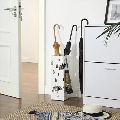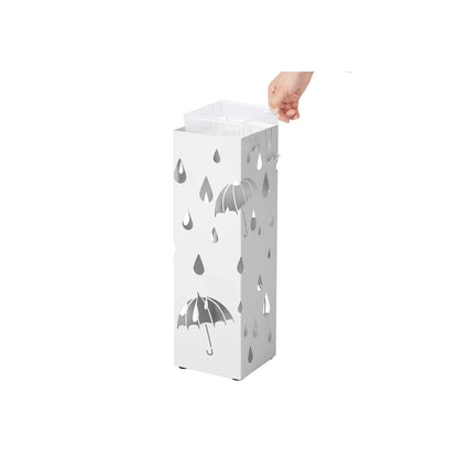 Deze ijzeren paraplubak is zowel functioneel als stijlvol. Het gatenpatroon van regendruppels en een open parasol is zeer toepasselijk voor een paraplubak. De standaard biedt u niet alleen opbergmogelijkheid, maar siert ook uw kamer, het zal zeker een blikvanger zijn in uw gang/entree Paraplubak 1x waterlekbak 4 x haken