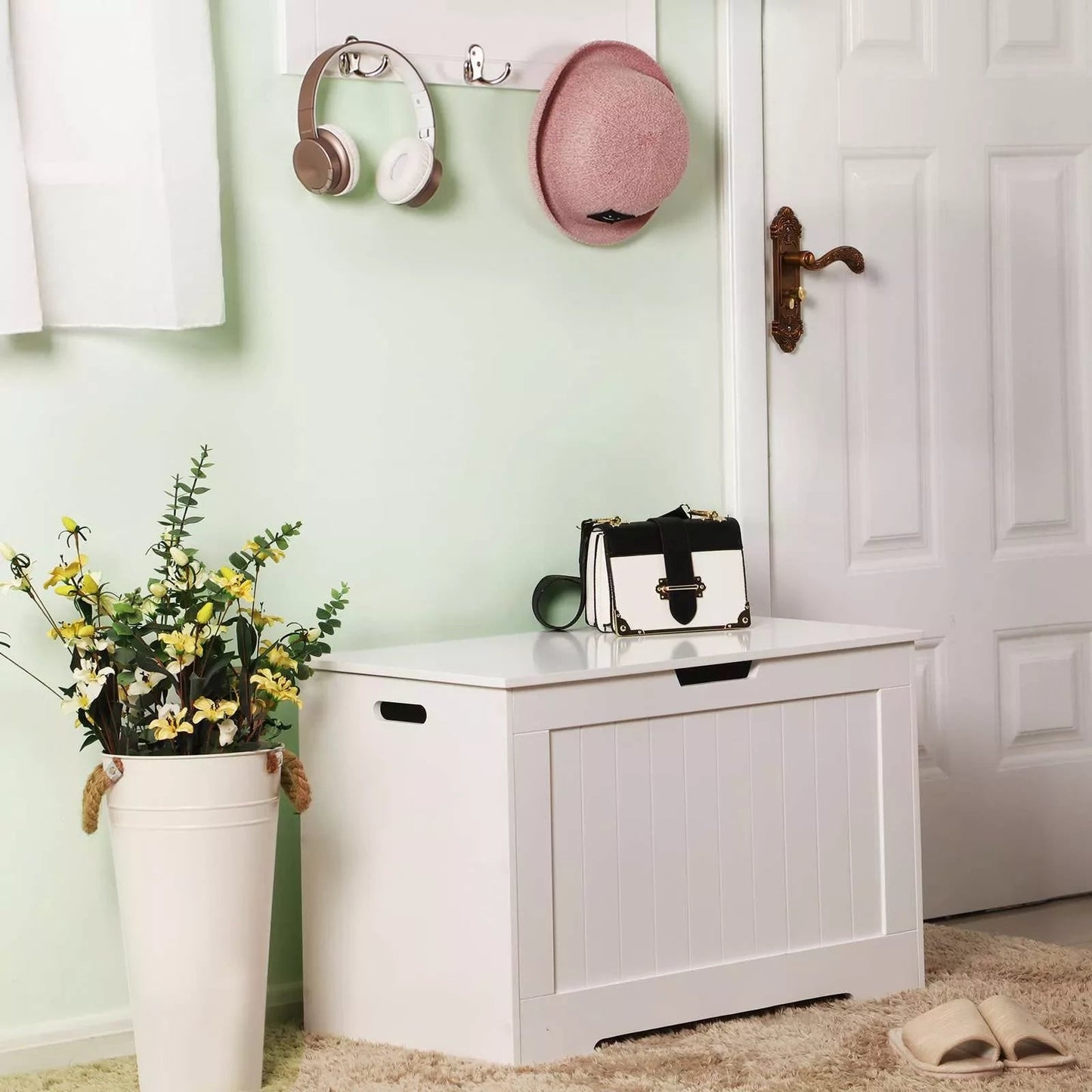 Deze opbergbank met klassieke witte afwerking past gemakkelijk in uw hal, speelkamer, slaapkamer of woonkamer en werkt uitstekend als schoenenbank, nachtkastje en speelgoedkist. Gebruik de opbergbank om boeken, kleding, schoenen en dekens uit het zicht te verbergen en neemt met het compacte formaat van 76 x 40 x 48 cm weinig ruimte in beslag. Veilig en gemakkelijk te gebruiken met veiligheidsscharnieren en ingebouwde handgrepen. Het hele frame is gemaakt van MDF-platen van E1-kwaliteit, het is stevig en duurzaam, de geverfde afwerking is glad en voegt een gevoel van elegantie toe.