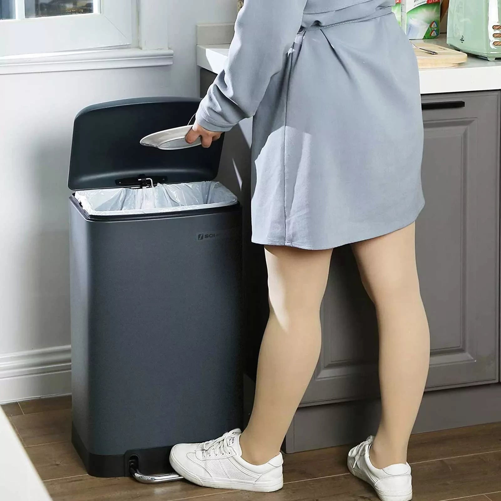 Recyclen kan ook eenvoudig zijn: u hoeft alleen maar op het pedaal te trappen en het afval in de binnenbak te gooien. Je hoeft de bak niet eens met je hand aan te raken, wat de hygiëne waarborgt. Daarnaast hoef je niet bang te zijn dat je hond de prullenbak omstoot en komt al het keukenafval op je vloer terecht. De deksel gaat pas open als je op het pedaal trapt. Een slimme oplossing voor afvalverwerking: deze afvalbak van 30 liter is robuust en compact en overtuigt door zijn doordachte design. De binnenemmer kan eenvoudig worden verwijderd en gereinigd met behulp van de zijhandgrepen; De opening aan de achterkant van de binnenemmer voorkomt dat je Mlltte wegglijdt. Productdetails: Kleur: Rookgrijs Materiaal: Buitenbak van RVS, binnenemmer van kunststof Afmeting: 34 x 25 x 61,5 cm (L x B x H) Afmeting binnenemmer: 32 x 22,5 x 52 cm (L x B x H) Totale hoogte (met geopende deksel): 82 cm Gewicht: 4,5 kg Capaciteit: 30 liter Leveringsomvang: 1 x afvalbak In en Outdoor match Opmerkingen: Plaats het product op een vlakke vloer. Sluit de emmer. Bedek de emmer niet volledig met uw hand , omdat deze mogelijk automatisch wordt gesloten. Om het product schoon te maken, veegt u het af met een zachte, vochtige doek en gebruikt u indien nodig een mild schoonmaakmiddel.