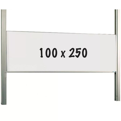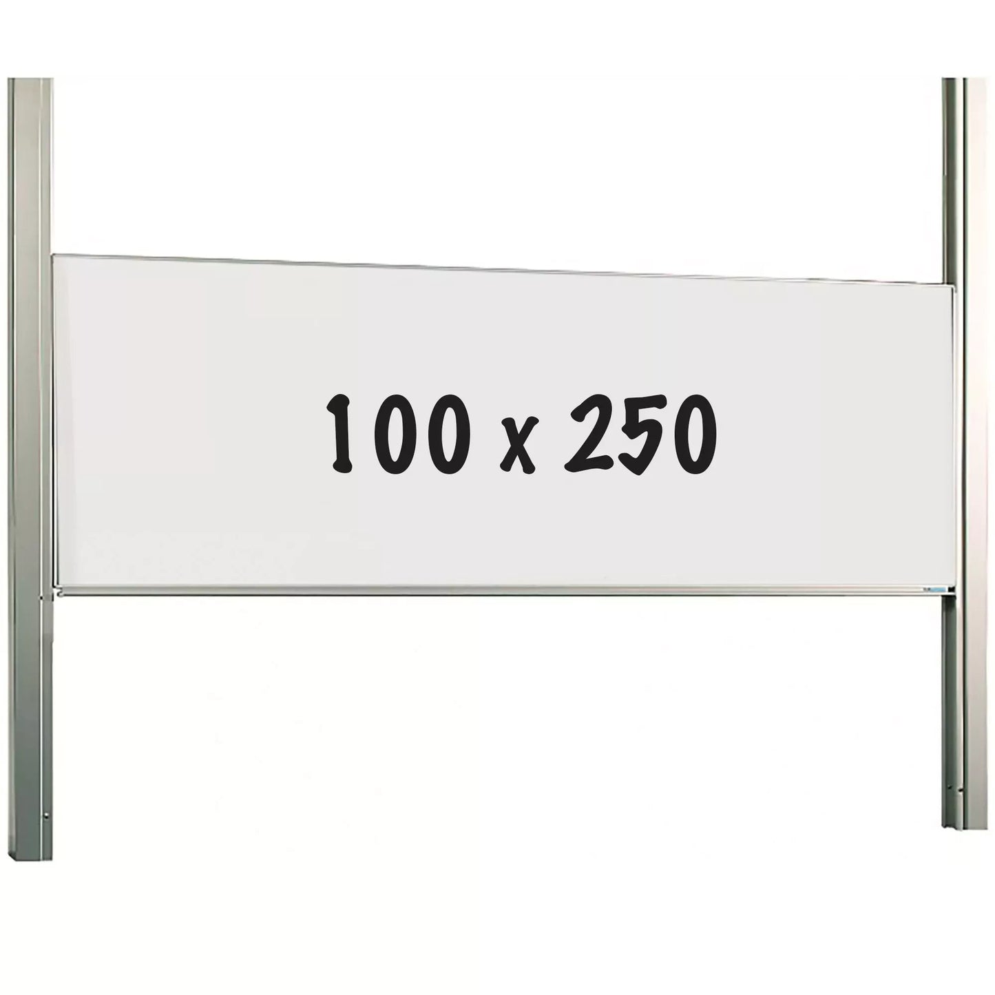 Bord met 1 schrijfoppervlak in geëmailleerd staal wit (800C) of groen. Geanodiseerd 19 mm aluminium profiel met kunststof hoekstukken en krijtopvanggoot. Montage tussen twee kolommen, standaard hoogte: 265 cm. Langere kolommen: optioneel.