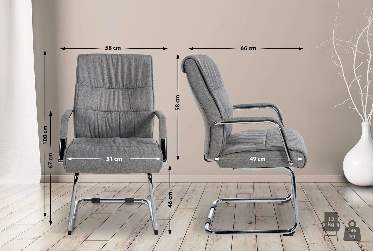 Deze set overtuigt niet alleen door zijn uitstekende ziteigenschappen, maar ook door zijn moderne design. Door de ruime zitting en de gecapitonneerde rugleuning zit je ook gedurende langere tijd comfortabel. Bovendien past de sledestoel zich dankzij de verende constructie optimaal aan de individuele beenlengte en het gewicht van de gebruiker aan. De stoel is bekleed met een onderhoudsvriendelijke stoffen bekleding.