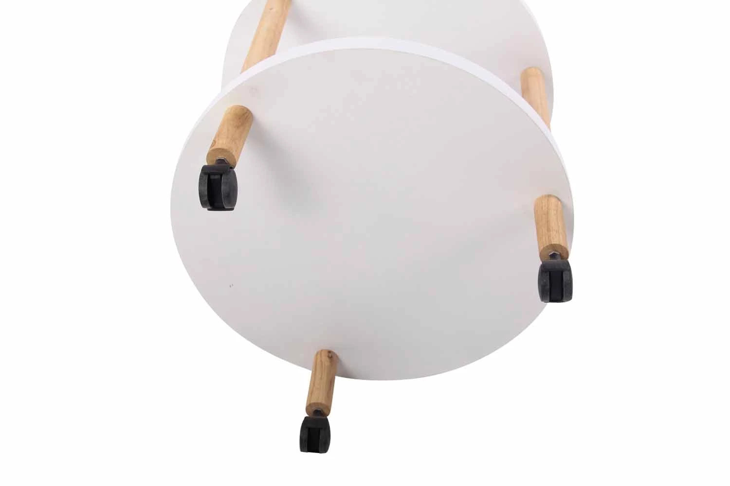 Deze bijzettafel kenmerkt zich onder meer door zijn functionaliteit, natuurlijkheid en design. Hij overtuigt als moderne bartafel en kan eenvoudig in elke woonomgeving worden geïntegreerd. Het ronde tafelblad is gemaakt van MDF en ligt stabiel en stabiel op een rubberhouten frame. Het frame is voorzien van drie zwenkwielen, waardoor deze tafel zonder problemen verplaatst kan worden.