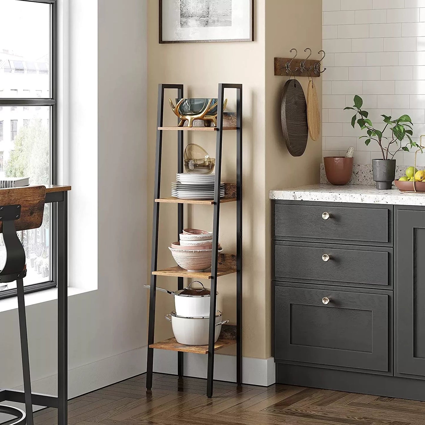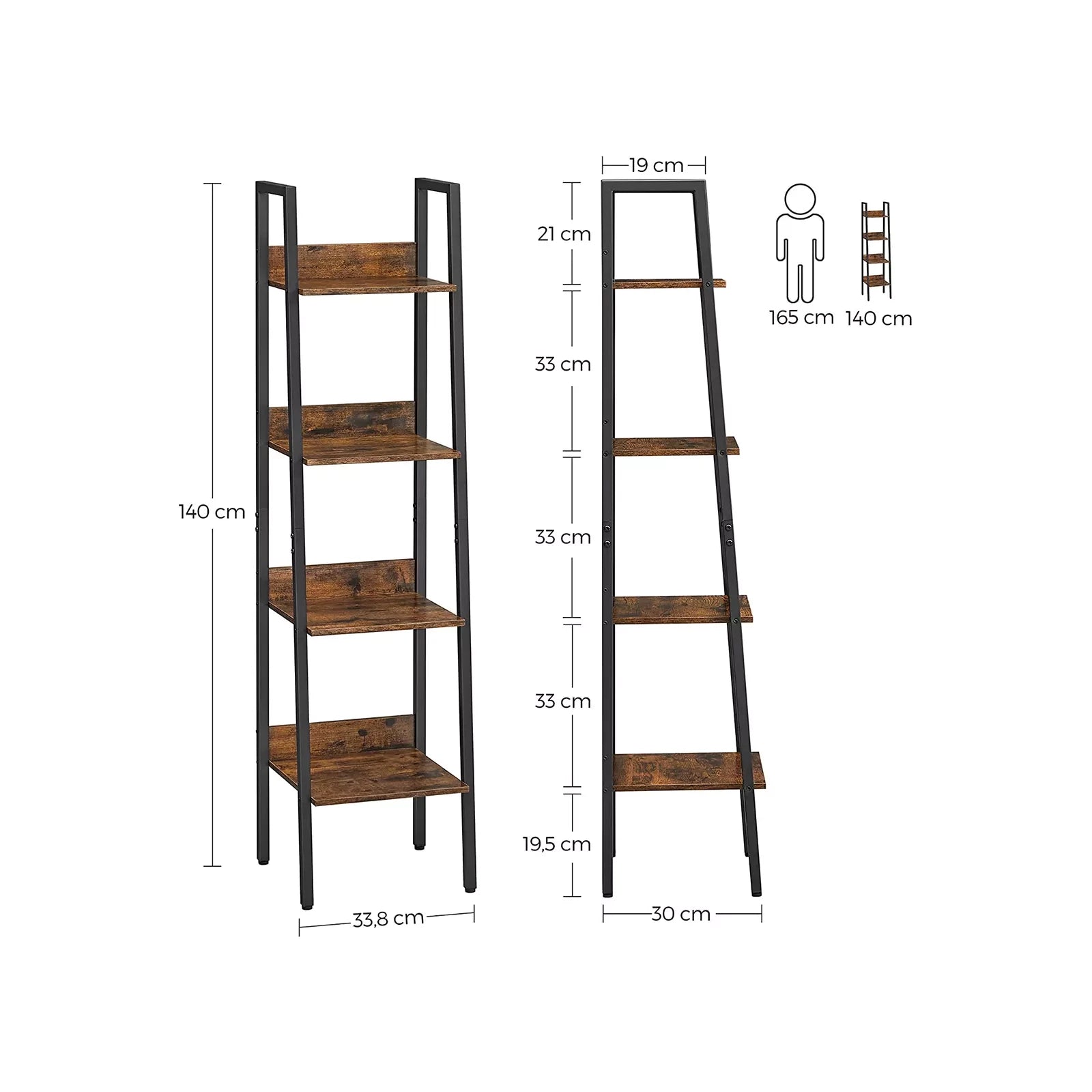 Productdetails: - Kleur: vintage bruinzwart - Materiaal: spaanplaat, staal - Afmeting: 33,8 x 30 x 140 cm (L x B x H) - Gewicht: 6 kg - Max. statische belasting per plankniveau: 10 kg Leveringsomvang: - 1 x ladderplank - 1 x accessoirepakket - 2 x anti-tips - 1 x instructiesInand Outdoormatch Opmerkingen: - Bevestig dit product aan de muur met de meegeleverde anti-tips.- Om veiligheidsredenen mogen kinderen niet op het product klimmen of ermee spelen.