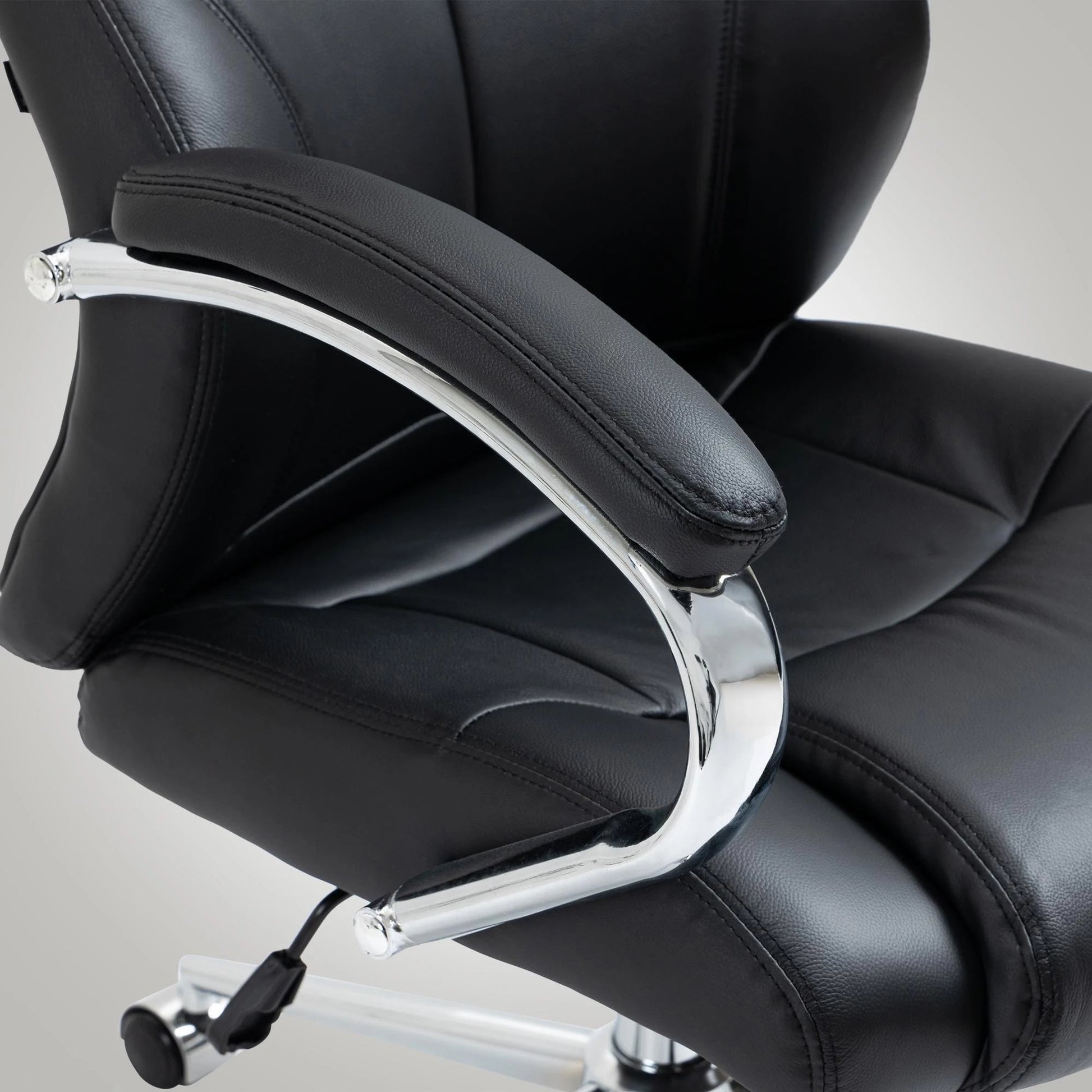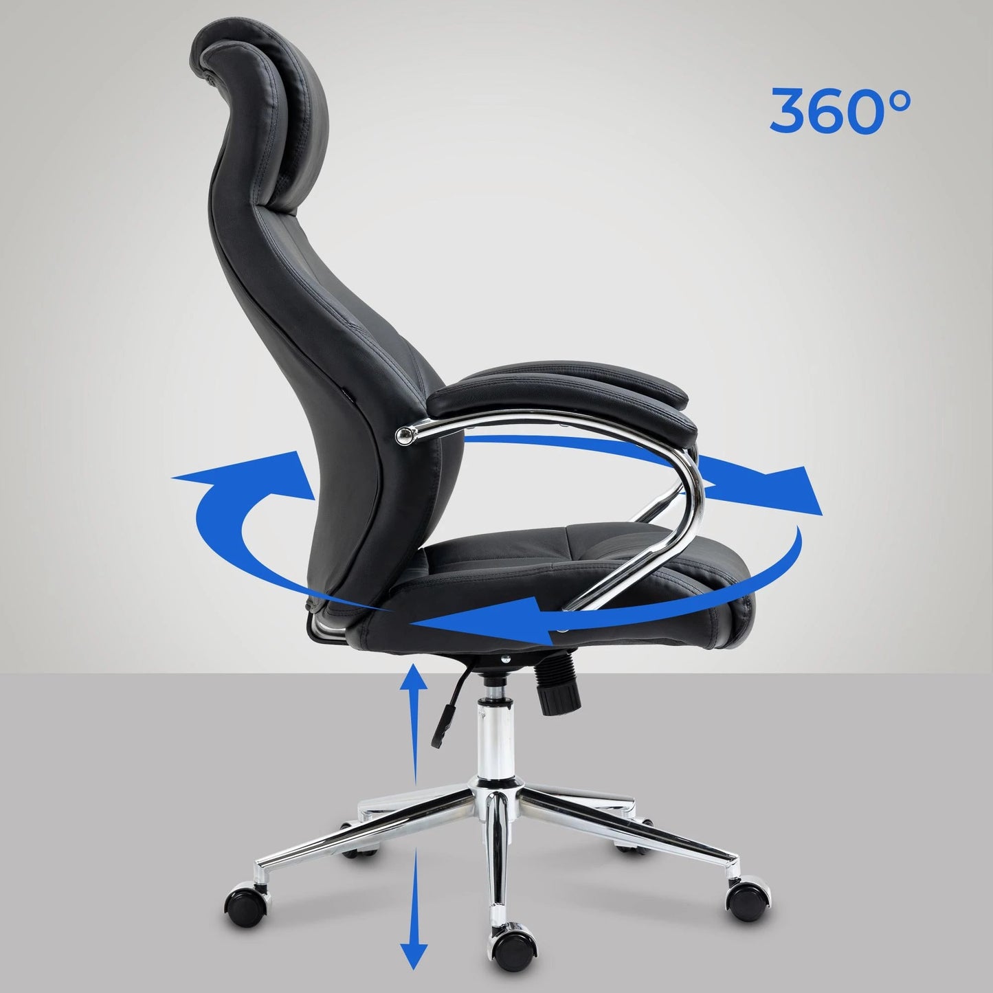 De bekleding is voorzien van een echt lederen bekleding van hoogwaardig, duurzaam rundleer en het stoelframe is gemaakt van metaal met chroomlook. Met vijf beweegbare, lichtlopende kunststof wielen zorgt de draaistoel voor moeiteloos bewegen op de werkplek. De bureaustoel is flexibel in zithoogte en spanning van het schommelmechanisme te verstellen.