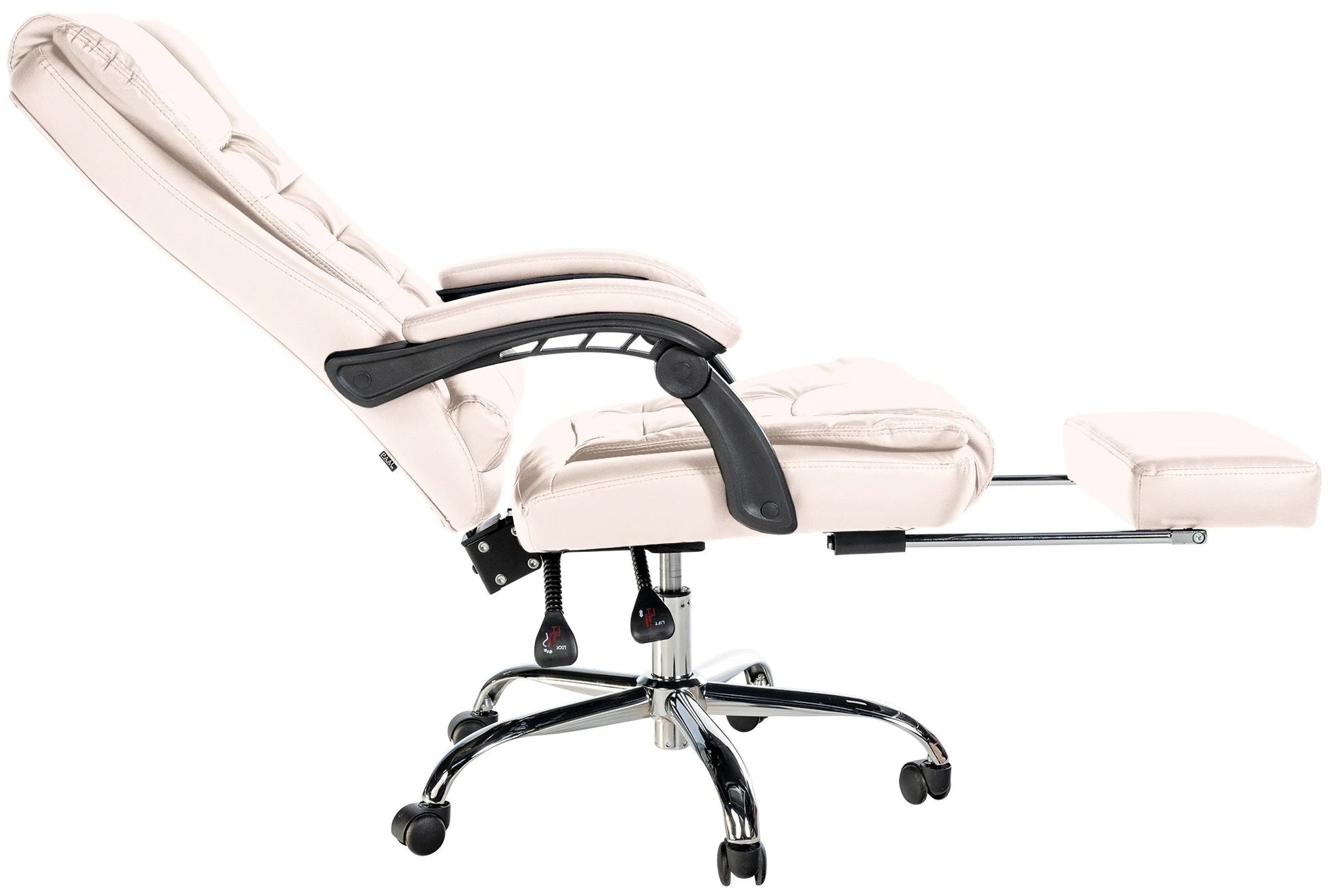 Dankzij de eenvoudig verstelbare voetensteun en rugleuning kun je lekker achterover leunen en ontspannen terwijl je je benen omhoog legt. De bureaustoel is traploos in hoogte verstelbaar waardoor hij precies op jouw lengte af te stellen is. Voor bewegingsvrijheid is de stoel 360 graden rond zijn eigen as te draaien. Hij staat veilig op vijf soepel lopende wielen en een metalen frame met chroomlook.