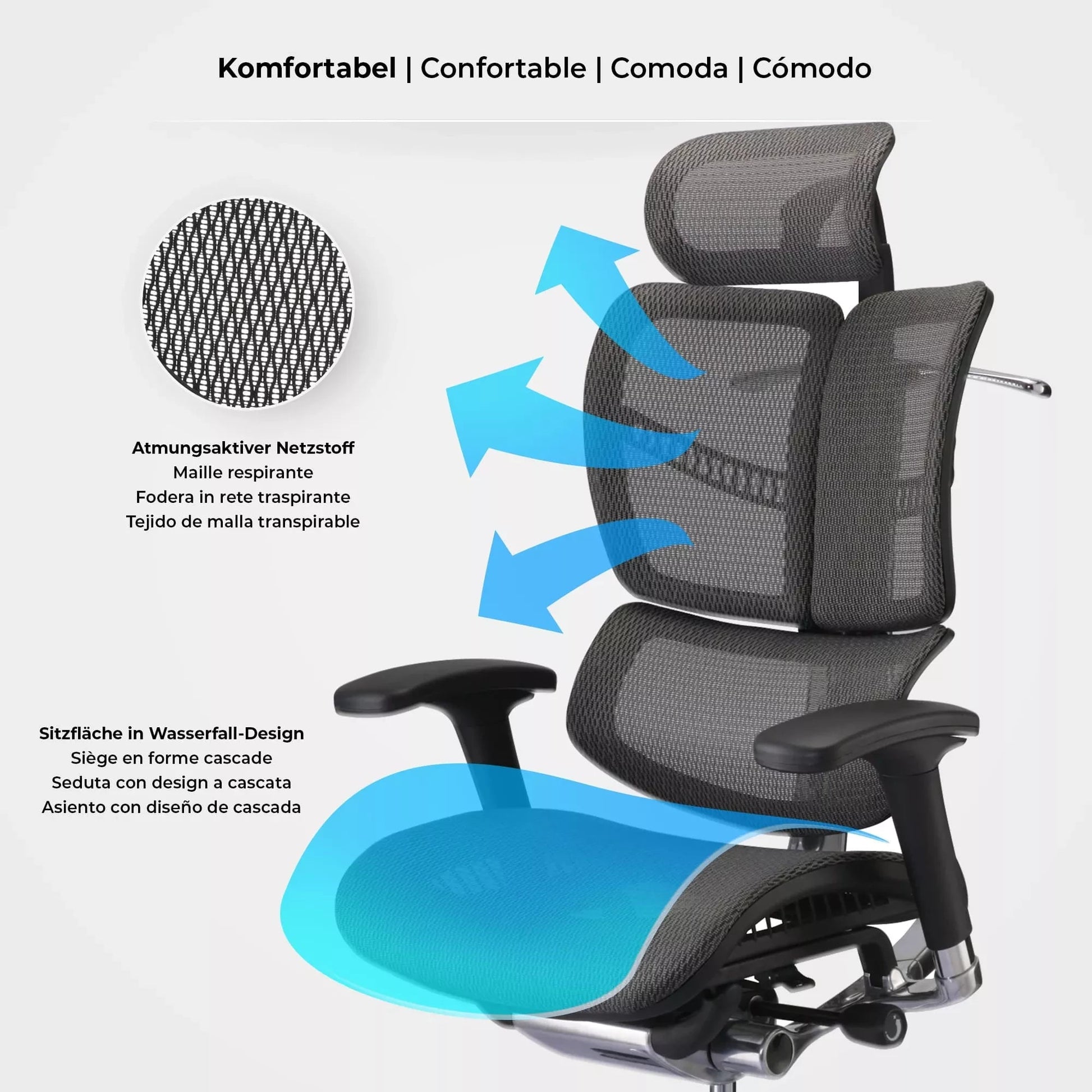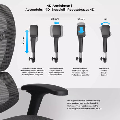 De weelderige zitting heeft een ronding die de belasting gelijkmatig over de dijen en billen verdeelt. Tenslotte zorgen de 4D-armleuningen voor ontlasting van het schouder- en nekgebied. 4D staat in dit verband voor vierdimensionale verstelbaarheid: naast de hoogte- en diepteverstelling zijn de armleuningen draaibaar en in de breedte verstelbaar.