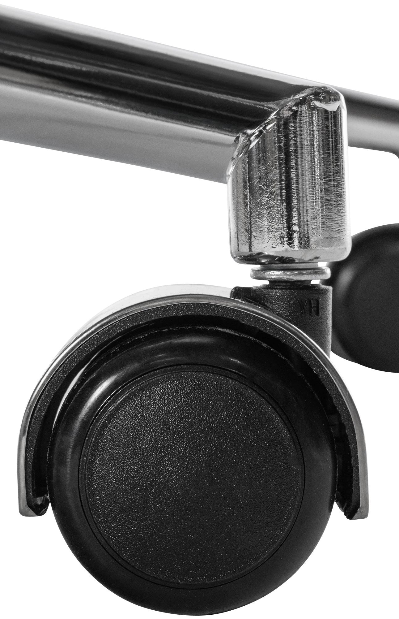 Het robuuste metalen frame met chroomlook zorgt voor stabiliteit en elegantie. Uitgerust met wielen kan deze draaistoel tot 135 kilogram dragen.
