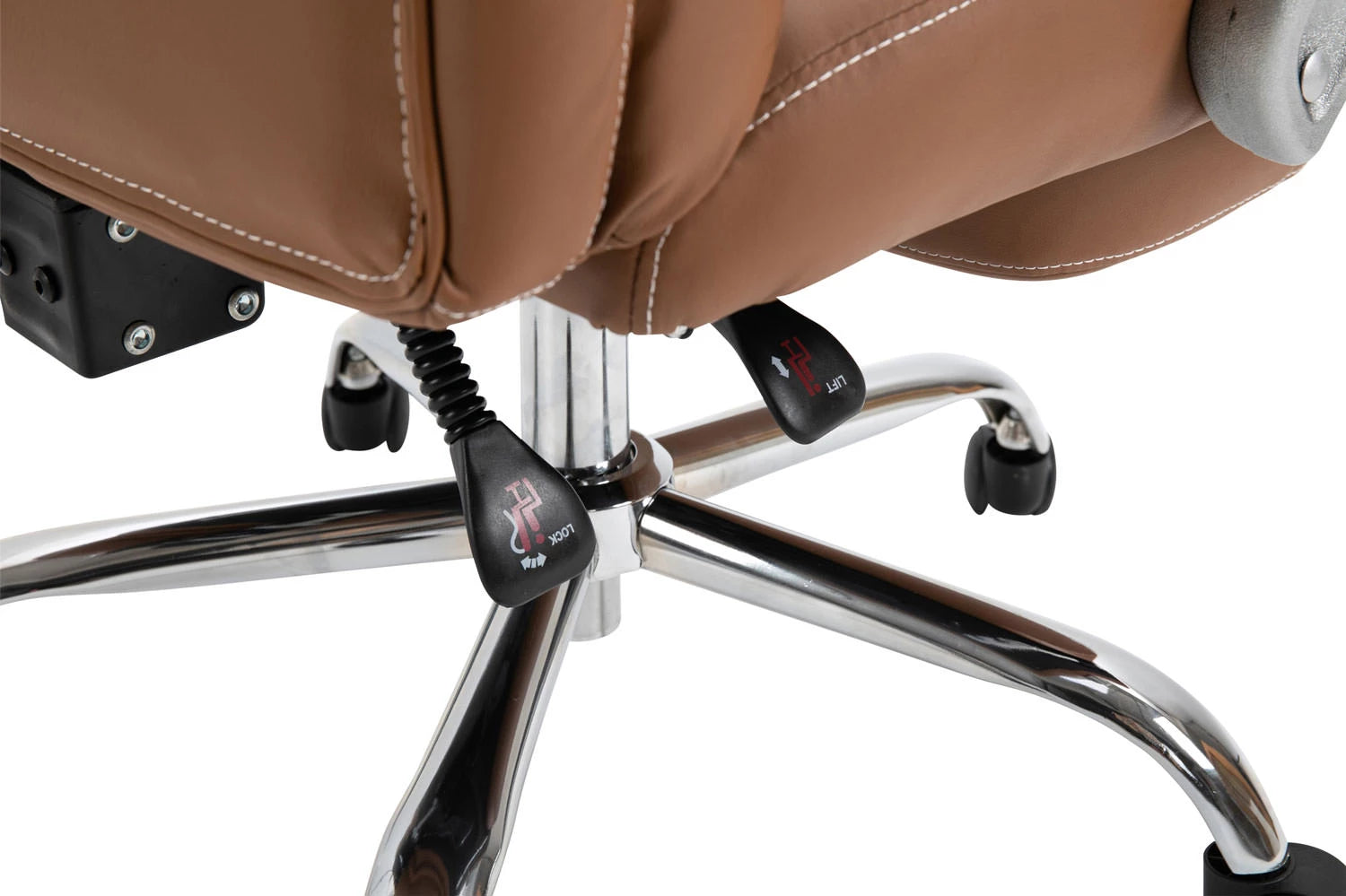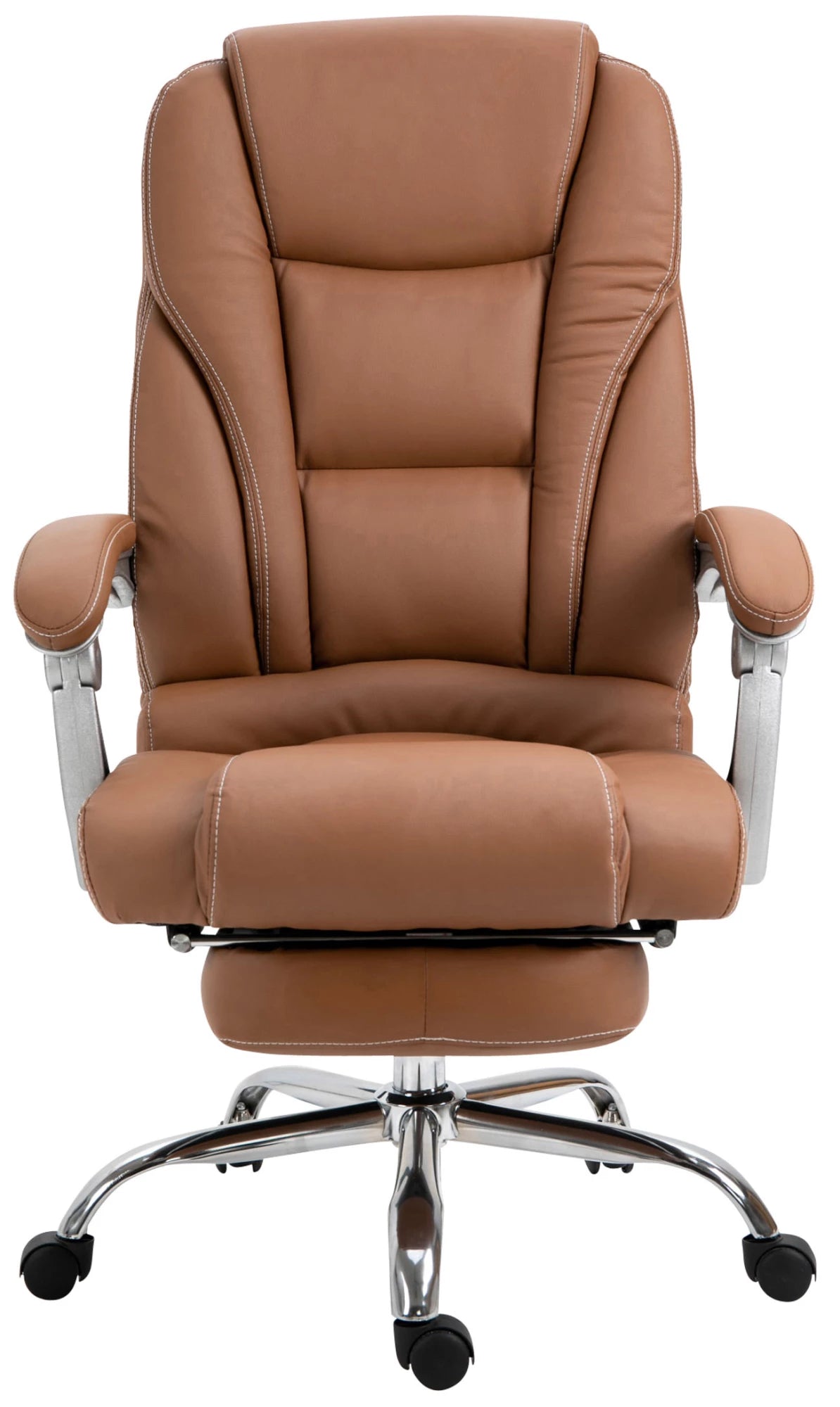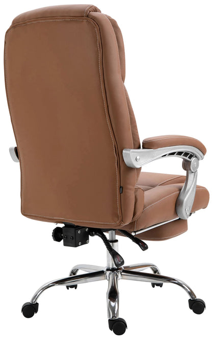 Deze indrukwekkende Leone bureaustoel overtuigt niet alleen door zijn elegante uitstraling, maar niemand kan hem verslaan als het gaat om comfort en duurzaamheid. De goede vulling en de onderhoudsvriendelijke kunstleren bekleding met stijlvolle sierstiksels zorgen voor een comfortabel zitgevoel, ook als je er langere tijd blijft. Dankzij de traploos verstelbare zithoogte garandeert de Leone bureaustoel bovendien altijd ergonomisch zitten. De gemakkelijk verstelbare voetsteun en rugleuning zorgen bovendien voor een aangename pauze tussendoor, waarbij u achterover kunt leunen en uw benen omhoog kunt leggen. Hij staat veilig op vijf lichtlopende wielen en een metalen frame in chroomlook. Of het nu een harde vloer of vloerbedekking is, u kunt altijd gemakkelijk en losjes over de vloer rollen.