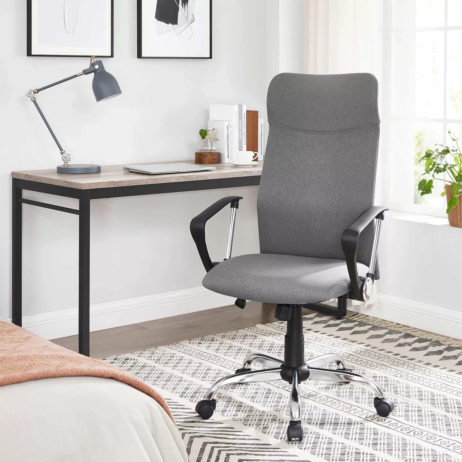 Verhoogde productiviteit, beter humeur: een juiste houding maakt de werktijden comfortabeler. Vind jouw ideale houding met deze bureaustoel: je lichaam komt tot rust, je geest wordt productiever en 8 werkuren vliegen voorbij. De voordelen van deze bureaustoel op een rij: Pas de hoogte van de stoel aan om een ideale zitpositie te vinden, passend bij de hoogte van je scherm Zit comfortabel op de 7 cm dikke, met schuim beklede zitting Dankzij de ergonomische vorm van de rugleuning kun je altijd werk met een rechte rug Ontspan je armen op de comfortabele armleuningen Door de schommelfunctie kun je een paar minuten comfortabel ontspannen en daarna weer aan de slag Productdetails: Kleur: Grijs Materiaal: Staal, schuimvulling, polyester, nylon wielen Afmetingen van de stoel totaal: 63 x 63 x (110-120) cm (L x B x H)Hoogte van de zitting: 46,5-56,5 cmMae van de zitting: 49 x 44 cm (L x B) Afmetingen van de rugleuning: 46 x 65 cm (L x H) Hoogte van de armleuningen (vanaf de zitting): 21 cm Gewicht: 12 kg Max. Statisch draagvermogen: 120 kg Leveringsomvang: 1 x bureaustoel 1 x accessoirepakket 1 x handleiding (DE,EN,IT,FR,ES)InenBuitenmatch Opmerkingen:Stel het product niet langdurig bloot aan direct zonlicht. Houd het product uit de buurt van puntige en scherpe voorwerpen om schade aan het oppervlak te voorkomen.