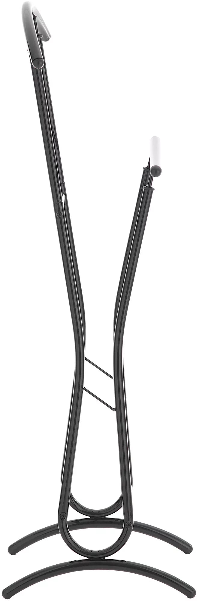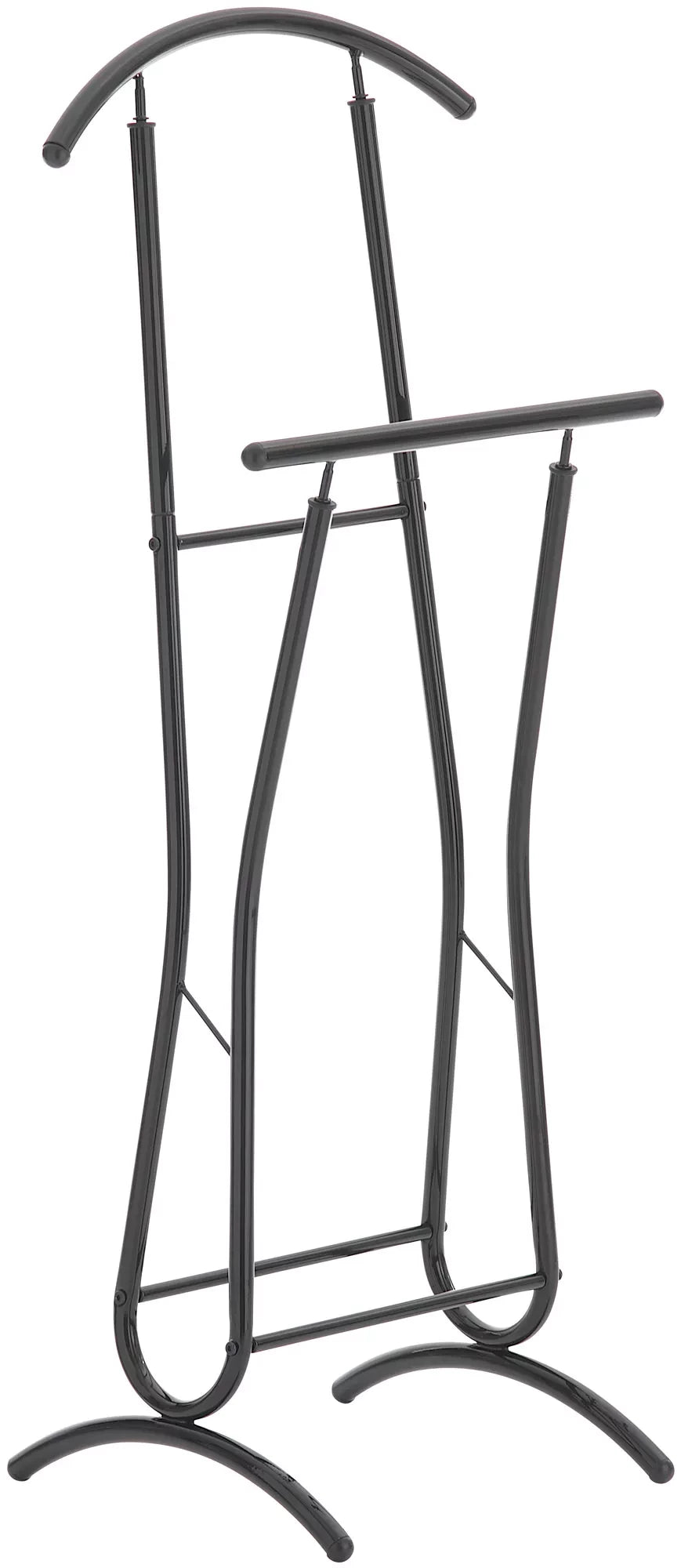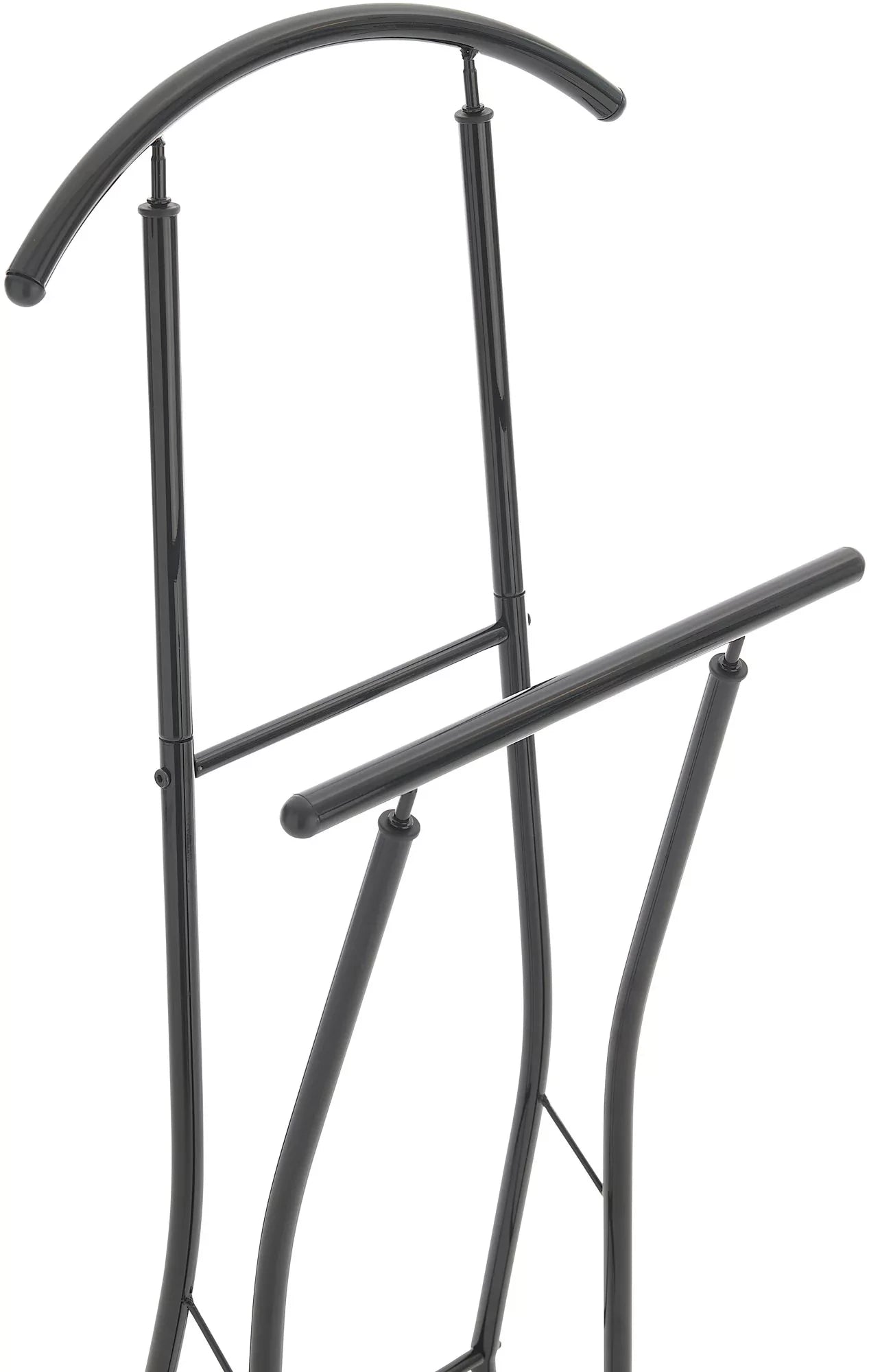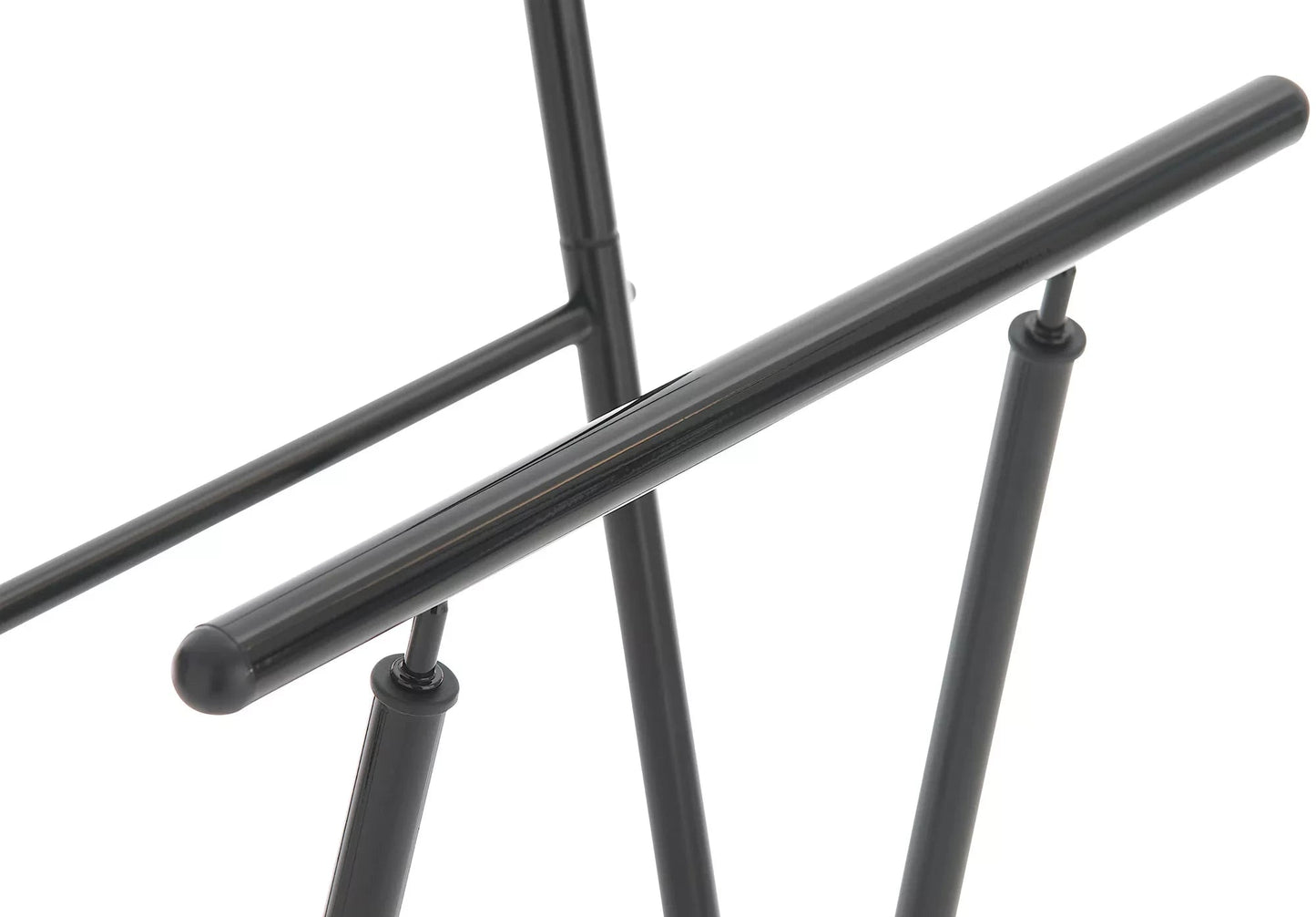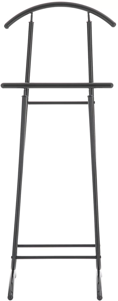 Stijlvolle valetstandaard van gepoedercoat metaal. De twee stangen bieden voldoende ruimte voor je kleding. Er is een extra plank voor uw schoenen. Of het nu in de kleedkamer, badkamer of logeerkamer is. Deze bediende slaat altijd een goed figuur!