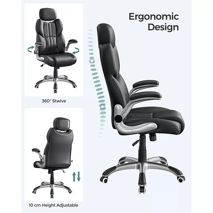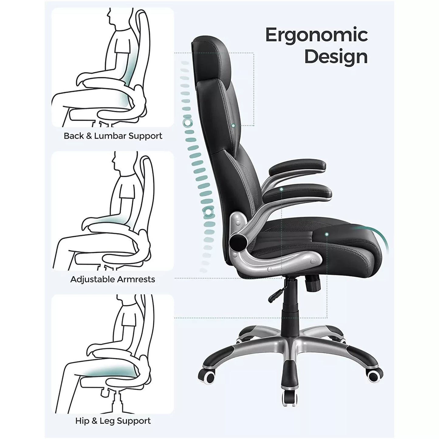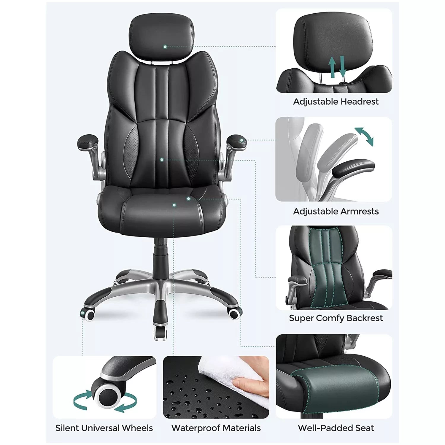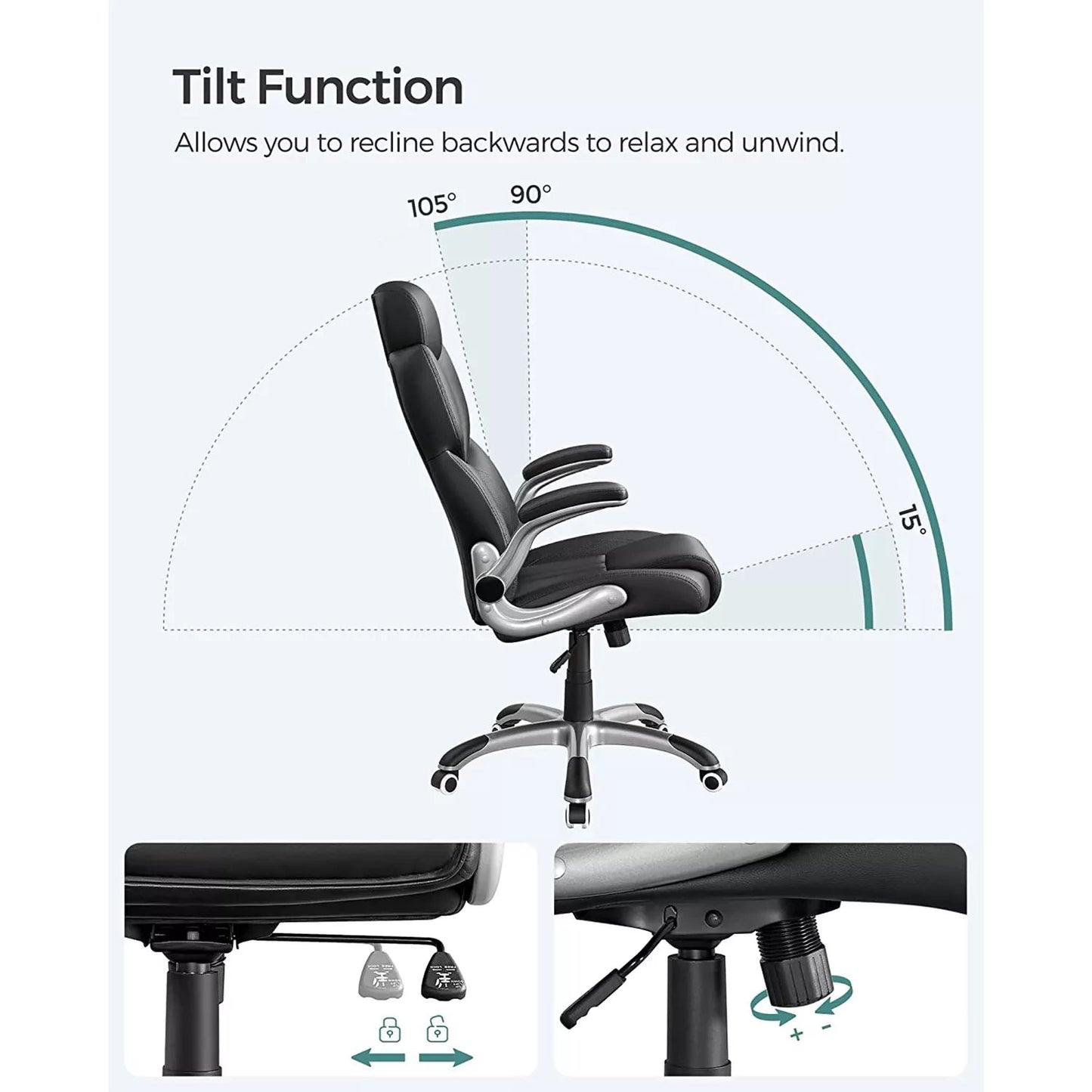 Verbeterd comfort, verhoogde productiviteit: Rugpijn veroorzaakt door een oncomfortabele stoel is niet alleen hinderlijk op het werk, maar heeft ook gevolgen voor alle andere gebieden. Deze ergonomische stoel van Inand Outdoormatch biedt u een hoog comfort, zodat u zich kunt concentreren op wat belangrijk is. Hoe kunt u uw productiviteit verhogen met deze draaistoel? De stijlvolle combinatie van zwarte kleur en gladde PU-hoes geeft je een nieuwe energieboost. Verstel de hoogte van de zitting en de hoofdsteun (in 3 standen verstelbaar) om de ideale zitpositie te vinden voor de hoogte van je scherm. De met schuim gevulde zitting en de ergonomische rugleuning zorg voor meer comfort tijdens het werkenEen beetje moe? Laat de stoel tot 20 graden achterover leunen. Met deze functie kunt u een paar minuten comfortabel ontspannen en vervolgens weer aan het werk gaan. Eindelijk klaar met werken! Klap de armleuningen van deze bureaustoel omhoog en schuif de stoel onder het bureau om ruimte te besparen Productdetails: Kleur: Zwart Materiaal: Multiplex, schuim, PU, nylon wielen Totale afmetingen: 70 x 72 x (119-129) cm (L x B x H) Zithoogte: 52-61 cm Afmetingen zitting: 51 x 52 cm (L x B) Afmetingen rugleuning (inclusief hoofdsteun): 51 x 91 cm (L x H) Hoogte van de armleuningen (vanaf de zitting): 24 cm Hoogte armleuningen (vanaf vloer): 71-81 cm Gewicht: 17,5 kg Max. Statisch draagvermogen: 150 kg Leveringsomvang: 1 x bureaustoel 1 x accessoirepakket 1 x handleiding In en Outdoor match Opmerkingen: Gebruik een kussen als u de stoel op een houten vloer wilt gebruiken. Bij gebruik van de schommelfunctie zijn de zitting en rugleuning van de stoel tegelijkertijd naar achteren gekanteld; de rugleuning is niet afzonderlijk kantelbaar.