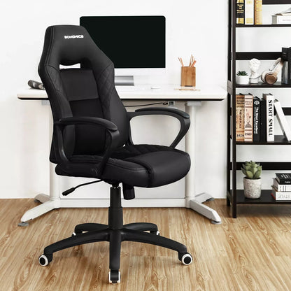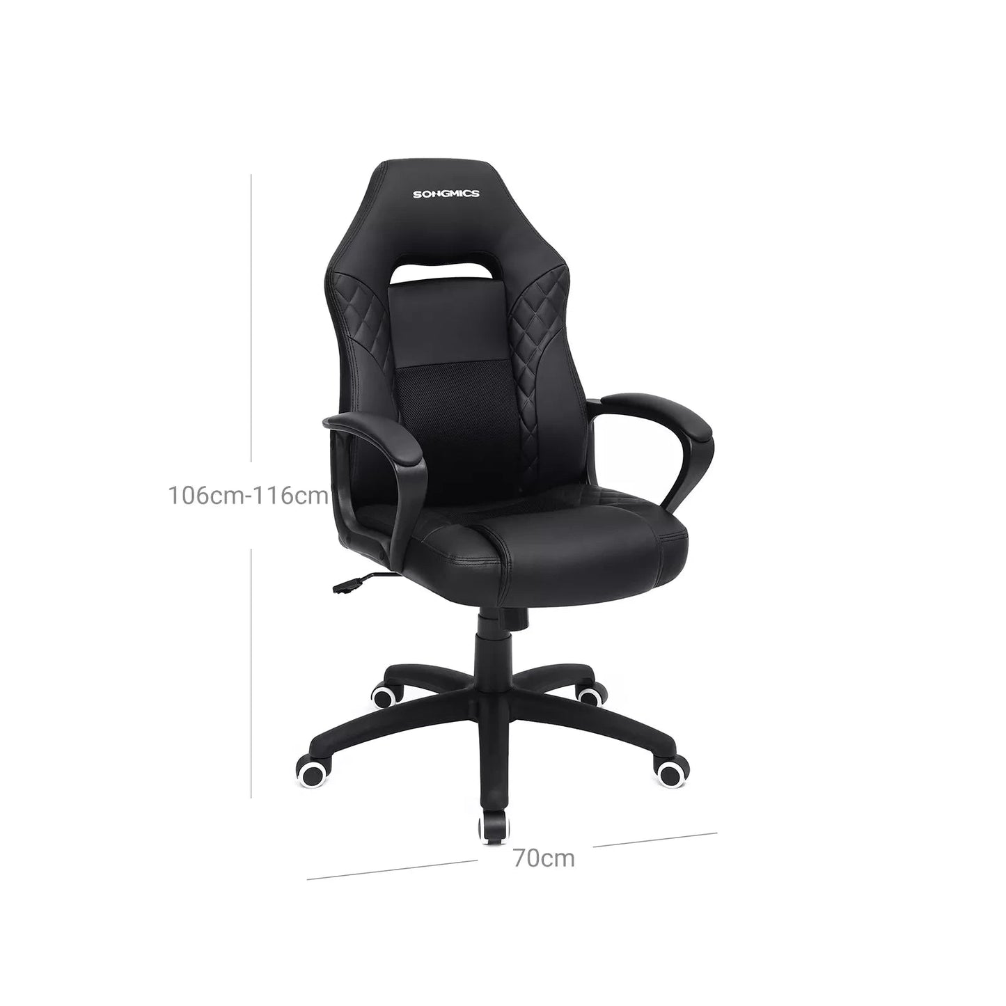 Gepassioneerde gamers en hardwerkende kantoorhelden verwachten de volgende voordelen: - Stijlvolle look met gewatteerd patroon op de kunstleren bekleding - Comfortabele, vormvaste schuimvulling - Ademende mesh-elementen voor een hoog zitcomfort - S-vormige rugleuning; biedt uw lumbale wervelkolom en uw nek een goede houvast - installatie is mogelijk in 10-15 minuten en kan door één persoon alleen worden uitgevoerd - gasfles en kunstleer getest door TV-geteste kwaliteit De gasfles van deze gamestoel voldoet aan de eisen van EN16955:2017 volgens het TV Rheinland testrapport -04, klasse 3 voor draagelementen van zelfdragende zithoogteverstelelementen met energieopslag voor bureauwerkstoelen (testrapport nr. 9465173_06). Onze leverancier heeft hiervoor een bijbehorend typegoedkeuringscertificaat ontvangen (nr. 182836, geldig tot 24 juni 2020). Rapportnummer 1160039759a 001). Productdetails: - Kleur: Zwart - Materiaal: PU-kunstleer, schuim, nylon - Totale afmetingen: 70 x 64 x 106-116 (L x B x H) - Breedte rugleuning: 50 cm - Hoogte rugleuning: 68 cm - Zitbreedte : 50 cm - Zitdiepte: 50 cm - Hoogte vloer tot zithoogte: 45-55 cm - Hoogte vloer tot armleuning: 65-75 cm - Gewicht: 14,5 kg - Max. statische belasting: 150 kg Leveringsomvang:- 1 x gamingstoel- 1 x inbussleutel- 1 x container met accessoires- 1 x handleiding (DE,EN,FR,ES,IT)Inenbuitenmatch Opmerkingen:- Stel het product niet bloot aan sterk zonlicht.- Houd het product uit de buurt van scherpe of puntige voorwerpen. voorwerpen om schade te voorkomen.