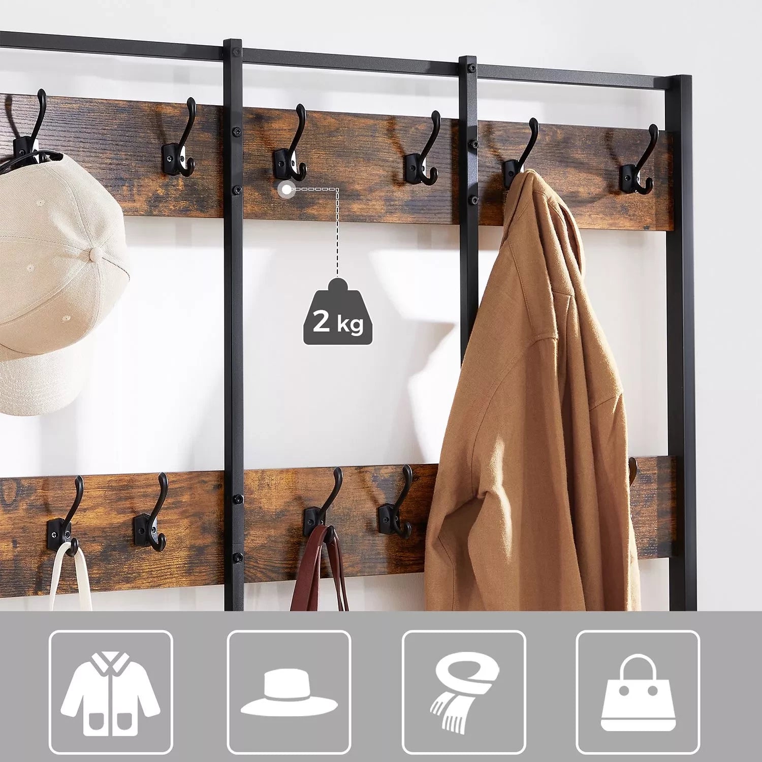 De ontwerpers van Inand Outdoormatch komen regelmatig met nieuwe ideeën voor praktische meubelen die je leven op een stijlvolle manier en tegen een betaalbare prijs een stukje comfortabeler maken. Zo geven ze u de mogelijkheid om van uw woning iets heel bijzonders te maken. Rustieke kledingkast in industrieel design Zo ontwierpen ze hierboven het kledingrek met een bankje waar je comfortabel op zit, 2 draadplanken voor het opbergen van schoenen en 12 haken voor het opbergen van kleding. Ontworpen in een trendy industrieel design met houten vintage elementen en een 30 mm dikke zitting, is de kapstok bijzonder geschikt voor grote of open ruimtes die nog niet te rommelig zijn met ander meubilair. Plaats het kledingrek bijvoorbeeld in de gang om jassen en jassen op te hangen en gemakkelijk je schoenen aan te trekken. Deze kledingkast mag echter niet het enige industriële designstuk in je huis zijn. Bekijk gerust ook de andere composities van InandOutdoormatch. Productdetails: Kleur: vintage bruin-zwart Materiaal: spaanplaat, staal Afmeting: 100 x 40 x 184 cm (L x B x H) Afmeting zitting: 96 x 37 cm (L x B) Gewicht: 17 kg Max. statisch draagvermogen per haak: 2 kgMax. statisch draagvermogen van de zitting: 90 kgMax. Statisch draagvermogen per roosterplank: 10 kg Leveringsomvang: 1 x kledingkast 1 x accessoiretas 1 x handleiding (DE, EN, FR, ES, IT)