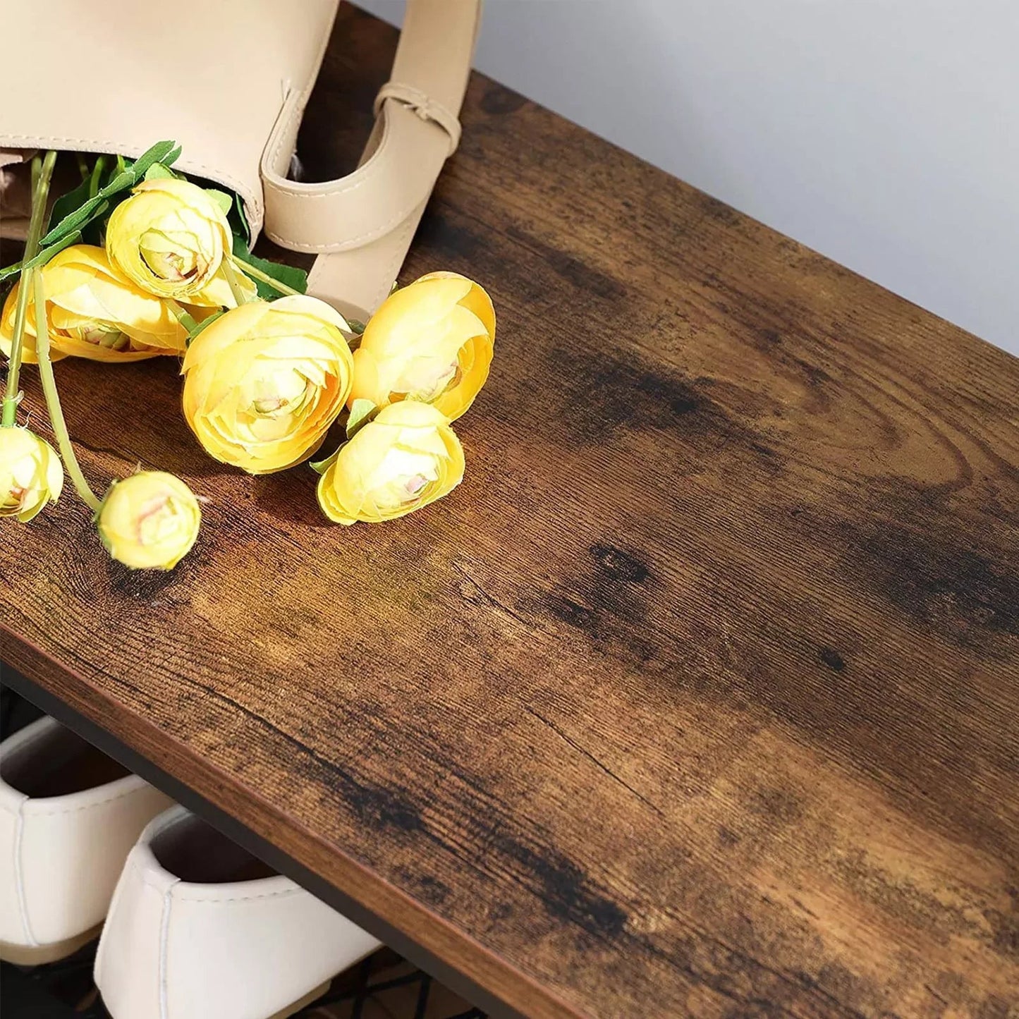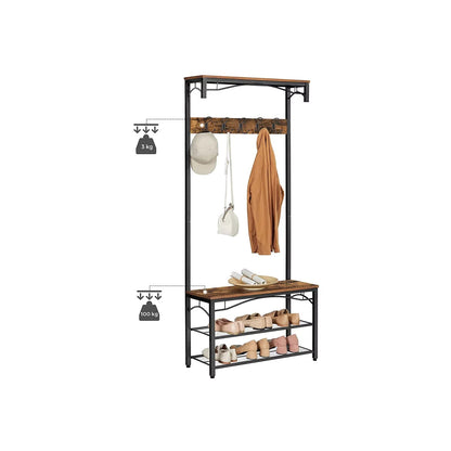 Op de hectische ochtend van een werkdag kan een praktische garderobekast in de gang erg handig zijn. Om u geld en ruimte te besparen, biedt InandOutdoormatch deze nieuwe kapstok aan die kapstokhaken, bank- en schoenenrekken perfect combineert. Kapstokhaken - Aan de 5 robuuste haken hang je je jassen, sleutels, mutsen, sjaals etc. netjes en binnen handbereik op. Bank - De spaanplaatplank in vintage-stijl biedt u een zitplaats bij het aan- en uittrekken van uw schoenen, maar is ook ideaal voor het opbergen van handtassen en opbergdozen, zodat uw gang netjes blijft. Schoenenrekken - De metalen rekken aan de onderkant houden je dagelijkse schoenen op één plek, zodat je niet elke dag tijd hoeft te verspillen aan het zoeken naar bijpassende schoenen. Haal dit sfeervolle, rustieke kledingrek in huis en verwelkom je gasten in een opgeruimde hal!