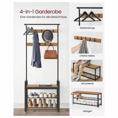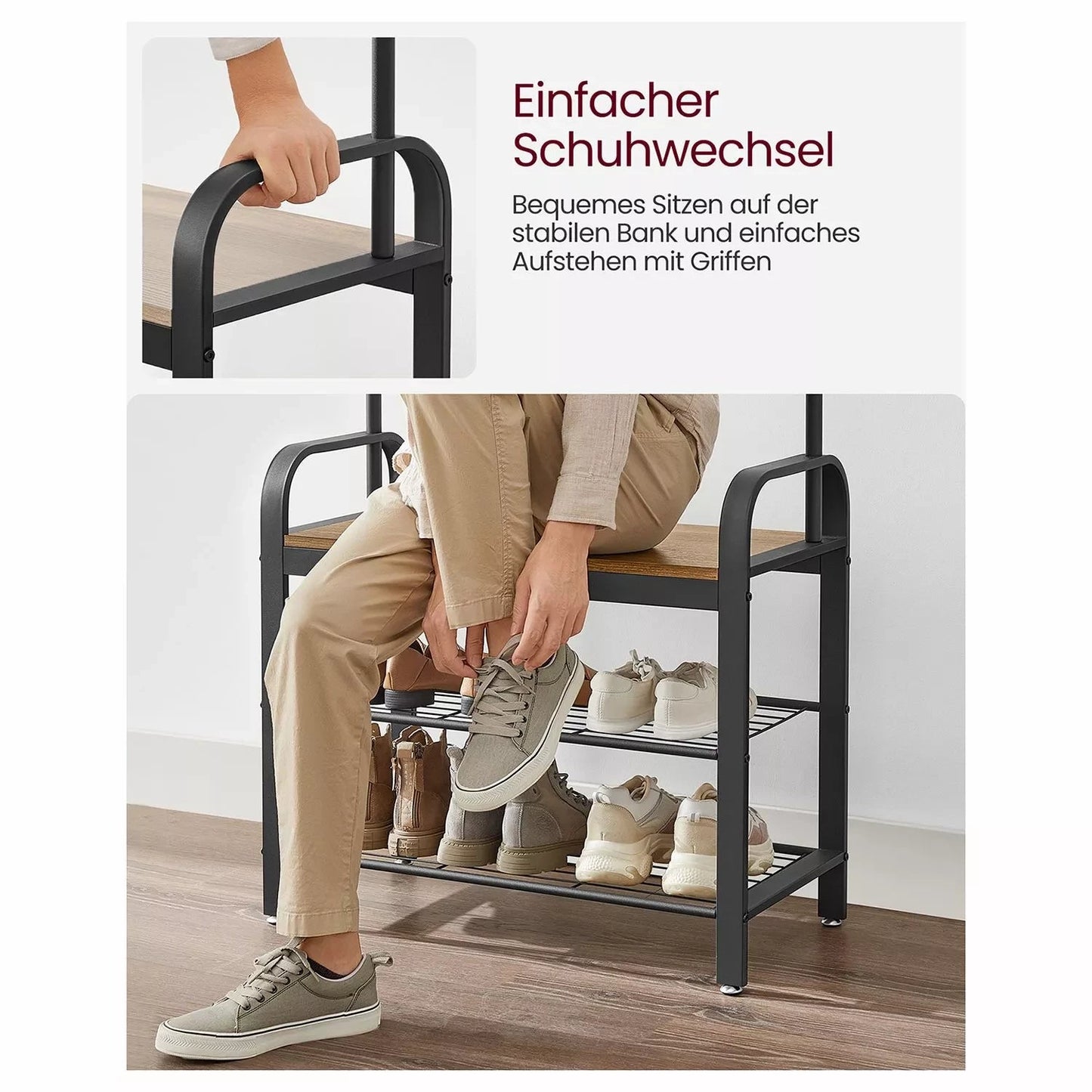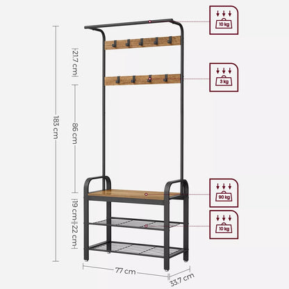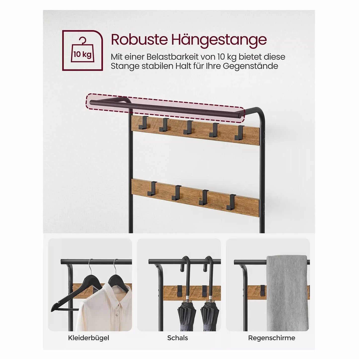 Productdetails: - Kleur: walnoot-zwart - Materiaal: spaanplaat, staal - Afmeting: 33,7 x 72 x 183 cm (D x B x H) - Gewicht: 9,8 kg - Max. statische belasting per haak: 3 kg - Max. statisch draagvermogen van de zitting: 80 kg Leveringsomvang: - 1 x kapstok - 1 x accessoirepakket - 1 x kantelbeveiliging - 1 x handleiding