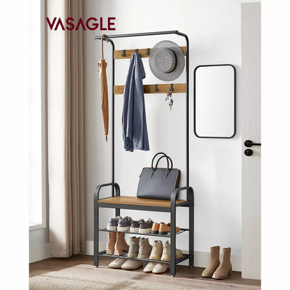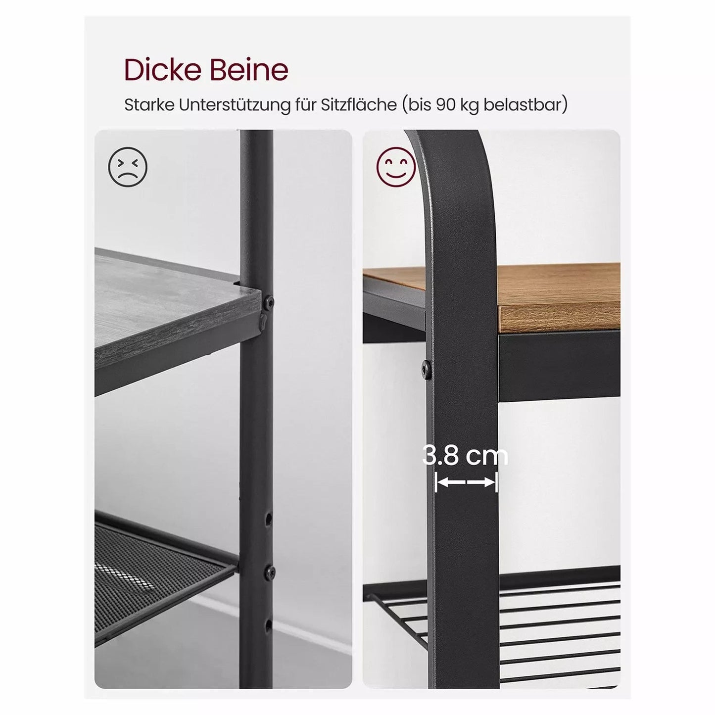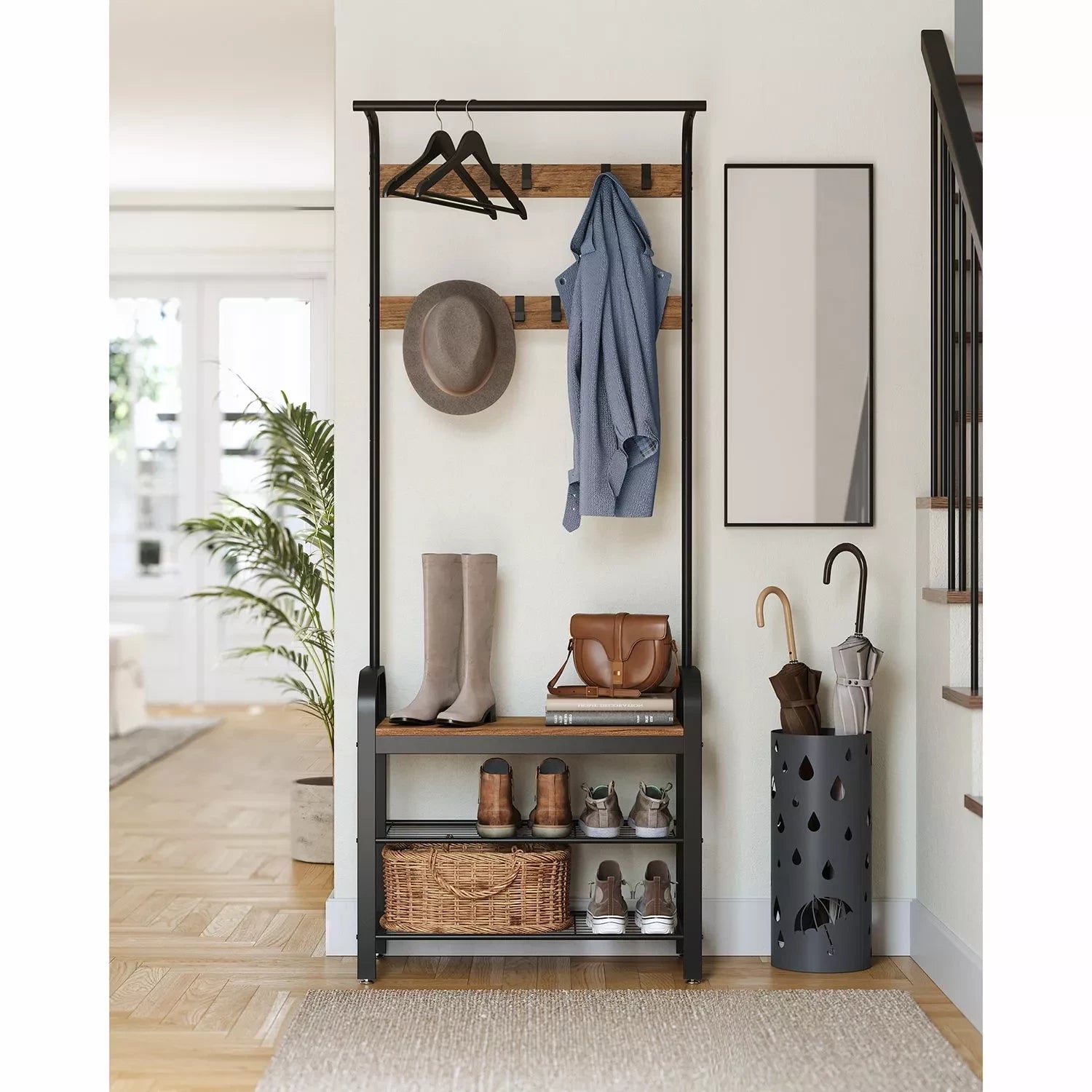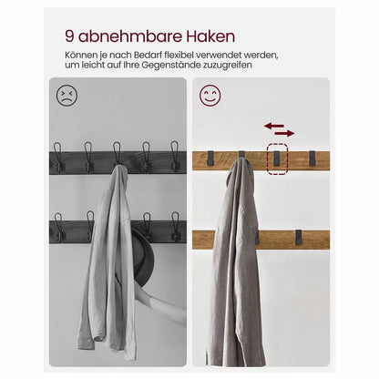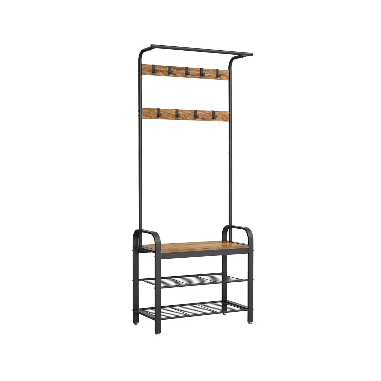 Productdetails: - Kleur: walnoot-zwart - Materiaal: spaanplaat, staal - Afmeting: 33,7 x 72 x 183 cm (D x B x H) - Gewicht: 9,8 kg - Max. statische belasting per haak: 3 kg - Max. statisch draagvermogen van de zitting: 80 kg Leveringsomvang: - 1 x kapstok - 1 x accessoirepakket - 1 x kantelbeveiliging - 1 x handleiding